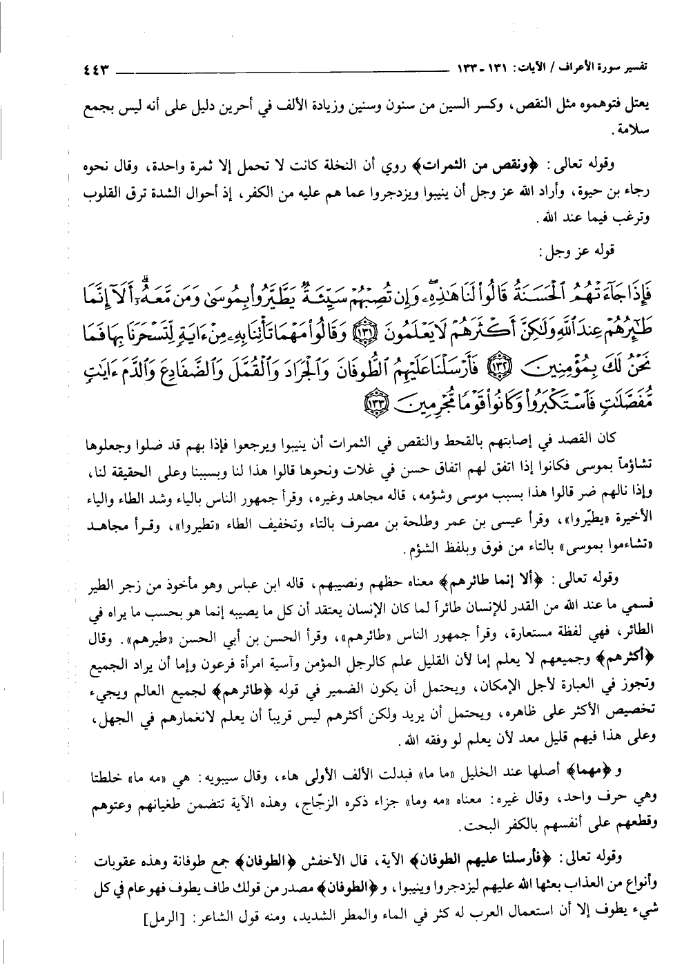 فَإِذا جاءَتْهُمُ الْحَسَنَةُ قالُوا لَنا هذِهِ وَإِنْ تُصِبْهُمْ سَيِّئَةٌ يَطَّيَّرُوا بِمُوسى وَمَنْ مَعَهُ أَلا إِنَّما طائِرُهُمْ عِنْدَ اللَّهِ وَلكِنَّ أَكْثَرَهُمْ لا يَعْلَمُونَ (١٣١) وَقالُوا مَهْما تَأْتِنا بِهِ مِنْ آيَةٍ لِتَسْحَرَنا بِها فَما نَحْنُ لَكَ بِمُؤْمِنِينَ (١٣٢) فَأَرْسَلْنا عَلَيْهِمُ الطُّوفانَ وَالْجَرادَ وَالْقُمَّلَ وَالضَّفادِعَ وَالدَّمَ آياتٍ مُفَصَّلاتٍ فَاسْتَكْبَرُوا وَكانُوا قَوْماً مُجْرِمِينَ (١٣٣)