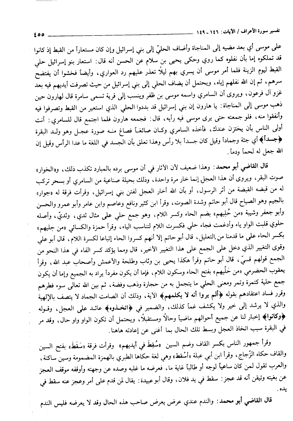 قال القاضي أبو محمد: وهذا ضعيف لأن الآثار في أن موسى برده بالمبارد تكذب ذلك، و «الخوار» صوت البقر، ويروى أن هذا العجل إنما خار مرة واحدة، وذلك بحيلة صناعية من السامري أو بسحر تركب له من قبضه القبضة من أثر الرسول، أو بأن الله أخار العجل لفتن بني إسرائيل، وقرأت فرقة له «جوار» بالجيم وهو الصياح قال أبو حاتم وشدة الصوت، وقرأ ابن كثير ونافع وعاصم وابن عامر وأبو عمرو والحسن وأبو جعفر وشيبة «من حليهم» بضم الحاء وكسر اللام، وهو جمع حلي على مثال ثدي، وثديّ، وأصله حلوي قلبت الواو ياء وأدغمت فجاء حلي فكسرت اللام لتناسب الياء، وقرأ حمزة والكسائي «من حليهم» بكسر الحاء على ما قدمنا من التعليل، قال أبو حاتم إلا أنهم كسروا الحاء اتباعا لكسرة اللام، قال أبو علي وقوى التغيير الذي دخل على الجمع على هذا التغيير الأخير، قال ومما يؤكد كسر الفاء في هذا النحو من الجمع قولهم قسيّ، قال أبو حاتم وقرأ هكذا يحيى بن وثاب وطلحة والأعمش وأصحاب عبد الله، وقرأ يعقوب الحضرمي «من حليهم» بفتح الحاء وسكون اللام، فإما أن يكون مفردا يراد به الجميع وإما أن يكون جمع حلية كتمرة وتمر ومعنى الحلي ما يتجمل به من حجارة وذهب وفضة، ثم بين الله تعالى سوء فطرهم وقرر فساد اعتقادهم بقوله أَلَمْ يَرَوْا أَنَّهُ لا يُكَلِّمُهُمْ الآية، وذلك أن الصامت الجماد لا يتصف بالإلهية والذي لا يرشد إلى خير ولا يكشف غما كذلك، والضمير في اتَّخَذُوهُ عائد على العجل، وقوله وَكانُوا إخبار لنا عن جميع أحوالهم ماضيا وحالا ومستقبلا، ويحتمل أن تكون الواو واو حال، وقد مر في البقرة سبب اتخاذ العجل وبسط تلك الحال بما أغنى عن إعادته هاهنا.