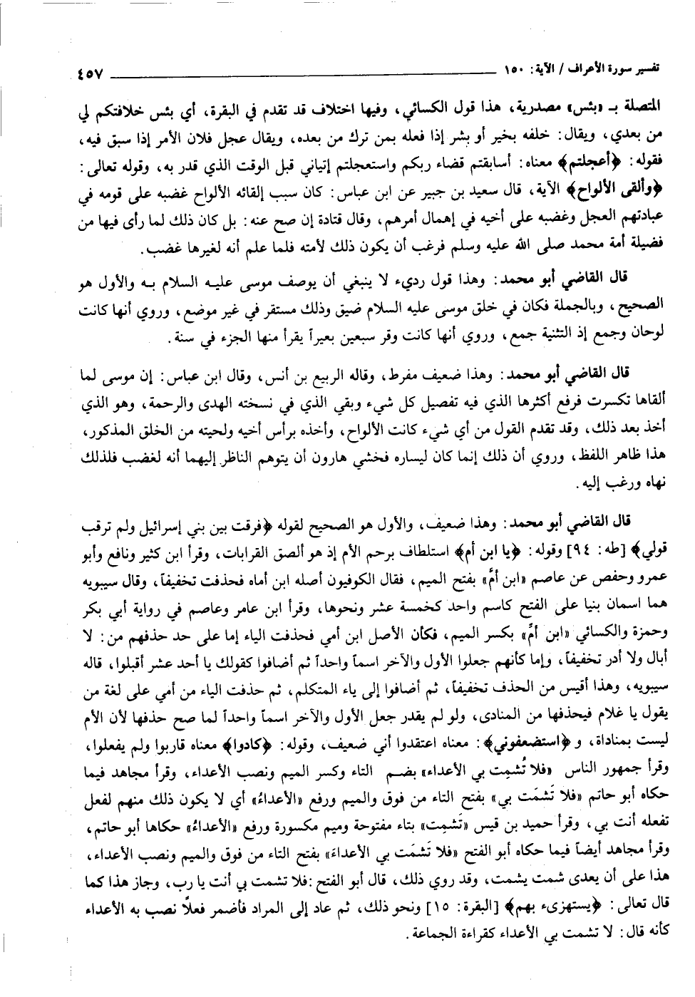 استلطاف برحم الأم إذ هو ألصق القرابات، وقرأ ابن كثير ونافع وأبو عمرو وحفص عن عاصم «ابن أمّ» بفتح الميم، فقال الكوفيون أصله ابن أماه فحذفت تخفيفا، وقال سيبويه هما اسمان بنيا على الفتح كاسم واحد كخمسة عشر ونحوها، وقرأ ابن عامر وعاصم في رواية أبي بكر وحمزة والكسائي «ابن أمّ» بكسر الميم، فكأن الأصل ابن أمي فحذفت الياء إما على حد حذفهم من: لا أبال ولا أدر تخفيفا، وإما كأنهم جعلوا الأول والآخر اسما واحدا ثم أضافوا كقولك يا أحد عشر أقبلوا، قاله سيبويه، وهذا أقيس من الحذف تخفيفا، ثم أضافوا إلى ياء المتكلم، ثم حذفت الياء من أمي على لغة من يقول يا غلام فيحذفها من المنادى، ولو لم يقدر جعل الأول والآخر اسما واحدا لما صح حذفها لأن الأم ليست بمناداة، واسْتَضْعَفُونِي: معناه اعتقدوا أني ضعيف، وقوله: كادُوا معناه قاربوا ولم يفعلوا، وقرأ جمهور الناس «فلا تشمت بي الأعداء» بضم التاء وكسر الميم ونصب الأعداء، وقرأ مجاهد فيما حكاه أبو حاتم «فلا تشمت بي» بفتح التاء من فوق والميم ورفع «الأعداء» أي لا يكون ذلك منهم لفعل تفعله أنت بي، وقرأ حميد بن قيس «تشمت» بتاء مفتوحة وميم مكسورة ورفع «الأعداء» حكاها أبو حاتم، وقرأ مجاهد أيضا فيما حكاه أبو الفتح «فلا تشمت بي الأعداء» بفتح التاء من فوق والميم ونصب الأعداء، هذا على أن يعدى شمت يشمت، وقد روي ذلك، قال أبو الفتح: فلا تشمت بي أنت يا رب، وجاز هذا كما قال تعالى: يَسْتَهْزِئُ بِهِمْ [البقرة: ١٥] ونحو ذلك، ثم عاد إلى المراد فأضمر فعلا نصب به الأعداء كأنه قال: لا تشمت بي الأعداء كقراءة الجماعة.