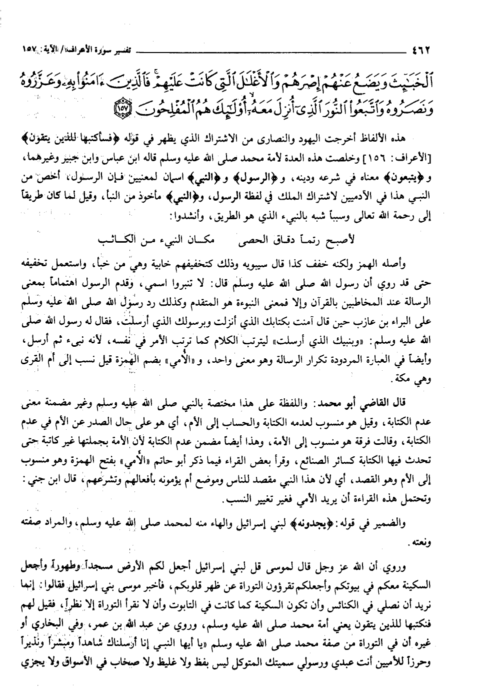 قال القاضي أبو محمد: واللفظة على هذا مختصة بالنبي صلى الله عليه وسلم وغير مضمنة معنى عدم الكتابة، وقيل هو منسوب لعدمه الكتابة والحساب إلى الأم، أي هو على حال الصدر عن الأم في عدم الكتابة، وقالت فرقة هو منسوب إلى الأمة، وهذا أيضا مضمن عدم الكتابة لأن الأمة بجملتها غير كاتبة حتى تحدث فيها الكتابة كسائر الصنائع، وقرأ بعض القراء فيما ذكر أبو حاتم «الأمي» بفتح الهمزة وهو منسوب إلى الأم وهو القصد، أي لأن هذا النبي مقصد للناس وموضع أم يؤمونه بأفعالهم وتشرعهم، قال ابن جني: