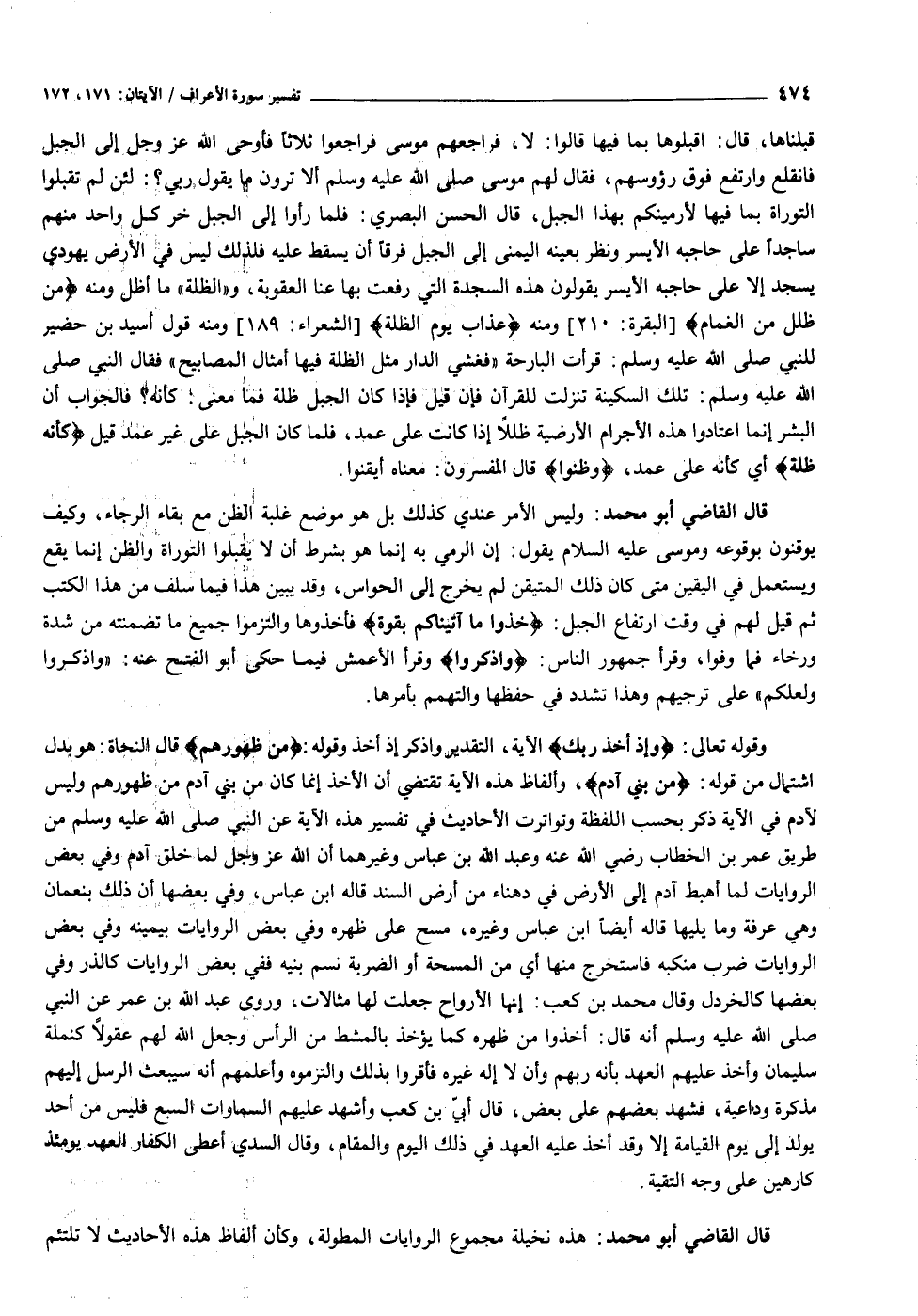وقوله تعالى: وَإِذْ أَخَذَ رَبُّكَ الآية، التقدير واذكر إذ أخذ وقوله: مِنْ ظُهُورِهِمْ قال النحاة: هو بدل اشتمال من قوله: مِنْ بَنِي آدَمَ، وألفاظ هذه الآية تقتضي أن الأخذ إنما كان من بني آدم من ظهورهم وليس لآدم في الآية ذكر بحسب اللفظة وتواترت الأحاديث في تفسير هذه الآية عن النبي صلى الله عليه وسلم من طريق عمر بن الخطاب رضي الله عنه وعبد الله بن عباس وغيرهما أن الله عز وجل لما خلق آدم وفي بعض الروايات لما أهبط آدم إلى الأرض في دهناء من أرض السند قاله ابن عباس، وفي بعضها أن ذلك بنعمان وهي عرفة وما يليها قاله أيضا ابن عباس وغيره، مسح على ظهره وفي بعض الروايات بيمينه وفي بعض الروايات ضرب منكبه فاستخرج منها أي من المسحة أو الضربة نسم بنيه ففي بعض الروايات كالذر وفي بعضها كالخردل وقال محمد بن كعب: إنها الأرواح جعلت لها مثالات، وروى عبد الله بن عمر عن النبي صلى الله عليه وسلم أنه قال: أخذوا من ظهره كما يؤخذ بالمشط من الرأس وجعل الله لهم عقولا كنملة سليمان وأخذ عليهم العهد بأنه ربهم وأن لا إله غيره فأقروا بذلك والتزموه وأعلمهم أنه سيبعث الرسل إليهم مذكرة وداعية، فشهد بعضهم على بعض، قال أبيّ بن كعب وأشهد عليهم السماوات السبع فليس من أحد يولد إلى يوم القيامة إلا وقد أخذ عليه العهد في ذلك اليوم والمقام، وقال السدي أعطى الكفار العهد يومئذ كارهين على وجه التقية.
