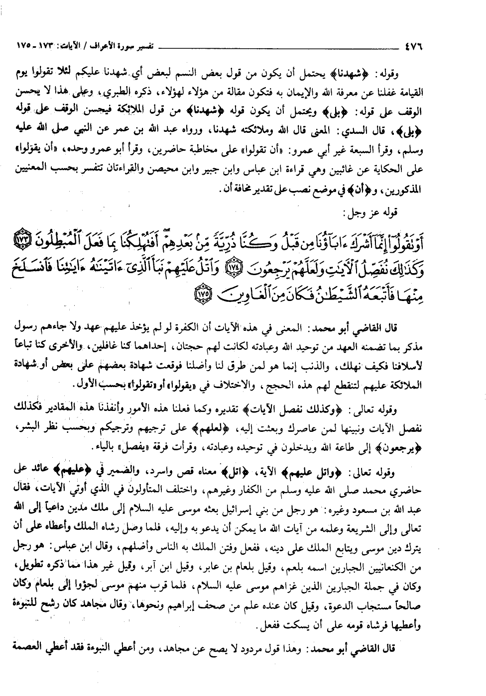 أَوْ تَقُولُوا إِنَّما أَشْرَكَ آباؤُنا مِنْ قَبْلُ وَكُنَّا ذُرِّيَّةً مِنْ بَعْدِهِمْ أَفَتُهْلِكُنا بِما فَعَلَ الْمُبْطِلُونَ (١٧٣) وَكَذلِكَ نُفَصِّلُ الْآياتِ وَلَعَلَّهُمْ يَرْجِعُونَ (١٧٤) وَاتْلُ عَلَيْهِمْ نَبَأَ الَّذِي آتَيْناهُ آياتِنا فَانْسَلَخَ مِنْها فَأَتْبَعَهُ الشَّيْطانُ فَكانَ مِنَ الْغاوِينَ (١٧٥)