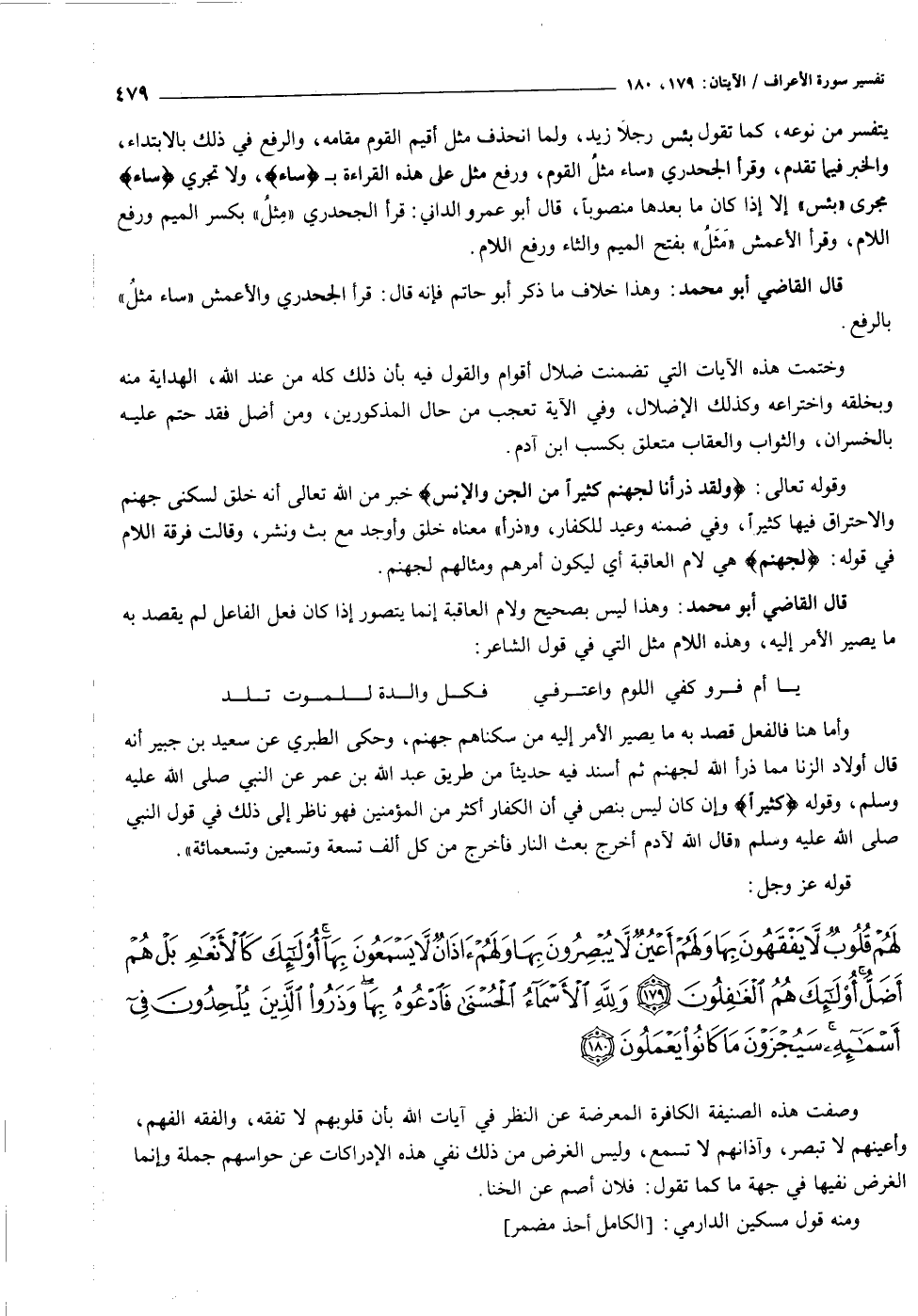 وأما هنا فالفعل قصد به ما يصير الأمر إليه من سكناهم جهنم، وحكى الطبري عن سعيد بن جبير أنه قال أولاد الزنا مما ذرأ الله لجهنم ثم أسند فيه حديثا من طريق عبد الله بن عمر عن النبي صلى الله عليه وسلم، وقوله كَثِيراً وإن كان ليس بنص في أن الكفار أكثر من المؤمنين فهو ناظر إلى ذلك في قول النبي صلى الله عليه وسلم «قال الله لآدم أخرج بعث النار فأخرج من كل ألف تسعة وتسعين وتسعمائة» .