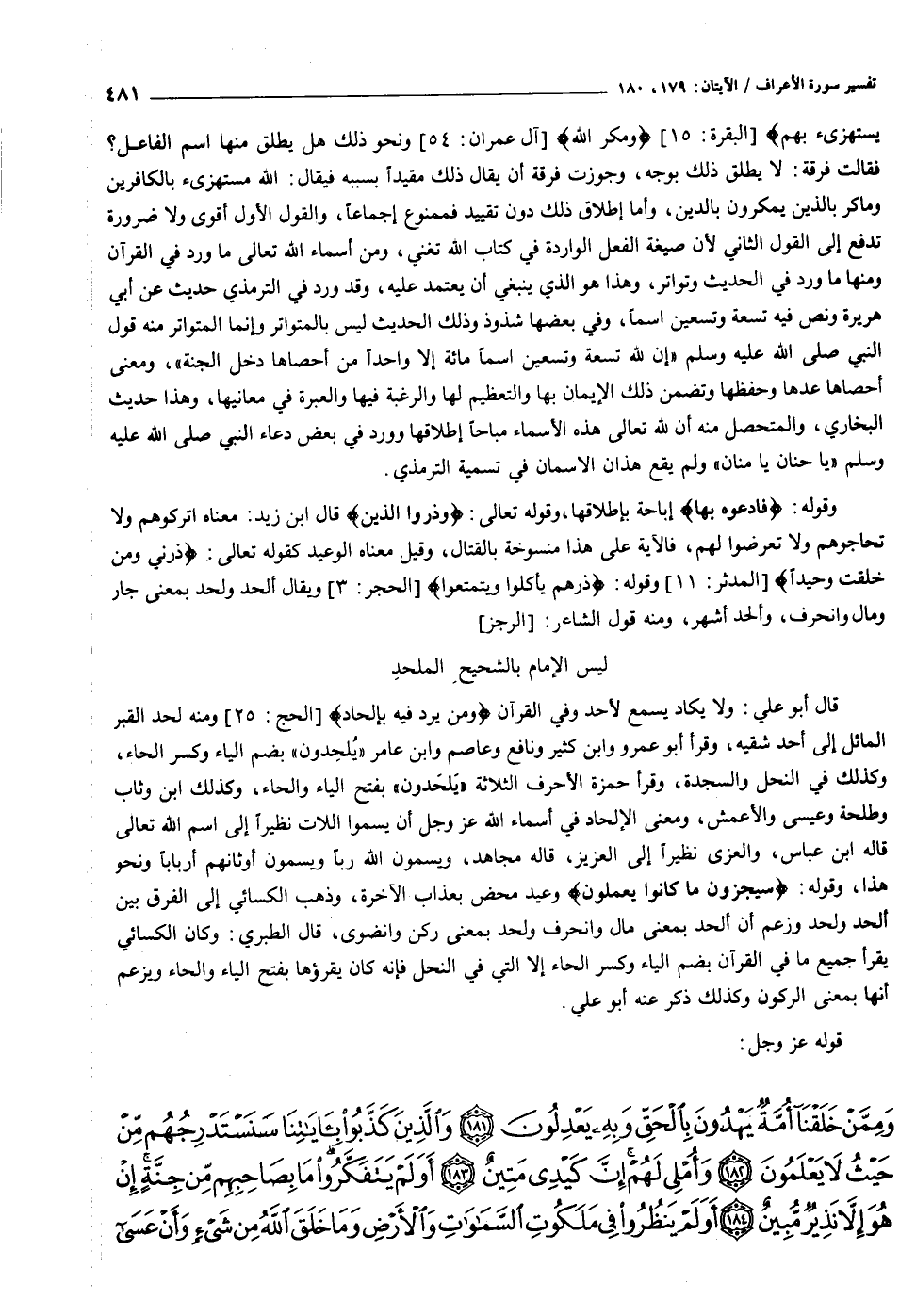 وقوله: فَادْعُوهُ بِها إباحة بإطلاقها، وقوله تعالى: وَذَرُوا الَّذِينَ قال ابن زيد: معناه اتركوهم ولا تحاجوهم ولا تعرضوا لهم، فالآية على هذا منسوخة بالقتال، وقيل معناه الوعيد كقوله تعالى: ذَرْنِي وَمَنْ خَلَقْتُ وَحِيداً [المدثر: ١١] وقوله: ذَرْهُمْ يَأْكُلُوا وَيَتَمَتَّعُوا [الحجر: ٣] ويقال ألحد ولحد بمعنى جار ومال وانحرف، وألحد أشهر، ومنه قول الشاعر: [الرجز] ليس الإمام بالشحيح الملحد قال أبو علي: ولا يكاد يسمع لأحد وفي القرآن وَمَنْ يُرِدْ فِيهِ بِإِلْحادٍ [الحج: ٢٥] ومنه لحد القبر المائل إلى أحد شقيه، وقرأ أبو عمرو وابن كثير ونافع وعاصم وابن عامر «يلحدون» بضم الياء وكسر الحاء، وكذلك في النحل والسجدة، وقرأ حمزة الأحرف الثلاثة «يلحدون» بفتح الياء والحاء، وكذلك ابن وثاب وطلحة وعيسى والأعمش، ومعنى الإلحاد في أسماء الله عز وجل أن يسموا اللات نظيرا إلى اسم الله تعالى قاله ابن عباس، والعزى نظيرا إلى العزيز، قاله مجاهد، ويسمون الله ربا ويسمون أوثانهم أربابا ونحو هذا، وقوله: سَيُجْزَوْنَ ما كانُوا يَعْمَلُونَ وعيد محض بعذاب الآخرة، وذهب الكسائي إلى الفرق بين ألحد ولحد وزعم أن ألحد بمعنى مال وانحرف ولحد بمعنى ركن وانضوى، قال الطبري: وكان الكسائي يقرأ جميع ما في القرآن بضم الياء وكسر الحاء إلا التي في النحل فإنه كان يقرؤها بفتح الياء والحاء ويزعم أنها بمعنى الركون وكذلك ذكر عنه أبو علي.