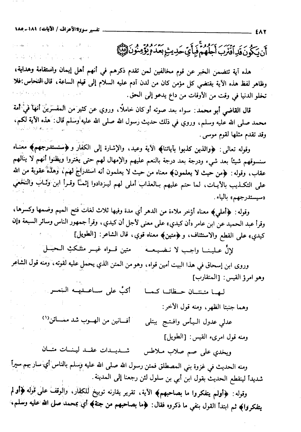 وقوله: أُمْلِي معناه أؤخر ملاءة من الدهر أي مدة وفيها ثلاث لغات فتح الميم وضمها وكسرها، وقرأ عبد الحميد عن ابن عامر «أن كيدي» على معنى لأجل أن كيدي، وقرأ جمهور الناس وسائر السبعة «إن كيدي» على القطع والاستئناف، ومَتِينٌ معناه قوي، قال الشاعر: [الطويل]