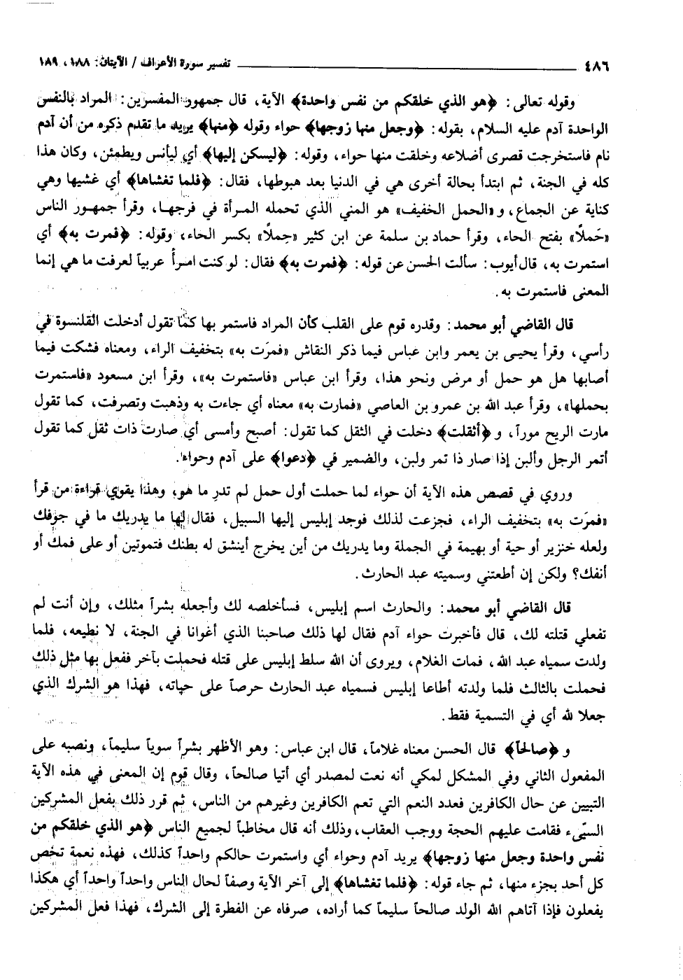 وقوله تعالى: هُوَ الَّذِي خَلَقَكُمْ مِنْ نَفْسٍ واحِدَةٍ الآية، قال جمهور المفسرين: المراد بالنفس الواحدة آدم عليه السلام، بقوله: وَجَعَلَ مِنْها زَوْجَها حواء وقوله مِنْها يريد ما تقدم ذكره من أن آدم نام فاستخرجت قصرى أضلاعه وخلقت منها حواء، وقوله: لِيَسْكُنَ إِلَيْها أي ليأنس ويطمئن، وكان هذا كله في الجنة، ثم ابتدأ بحالة أخرى هي في الدنيا بعد هبوطها، فقال: فَلَمَّا تَغَشَّاها أي غشيها وهي كناية عن الجماع، و «الحمل الخفيف» هو المني الذي تحمله المرأة في فرجها، وقرأ جمهور الناس «حملا» بفتح الحاء، وقرأ حماد بن سلمة عن ابن كثير «حملا» بكسر الحاء، وقوله: فَمَرَّتْ بِهِ أي استمرت به، قال أيوب: سألت الحسن عن قوله: فَمَرَّتْ بِهِ فقال: لو كنت امرأ عربيا لعرفت ما هي إنما المعنى فاستمرت به.