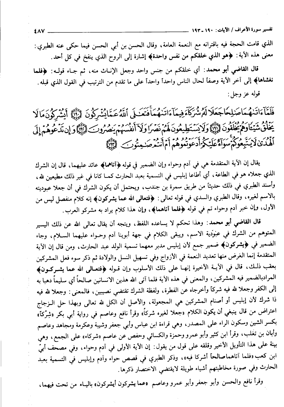 يقال إن الآية المتقدمة هي في آدم وحواء وإن الضمير في قوله آتاهُما عائد عليهما، قال إن الشرك الذي جعلاه هو في الطاعة، أي أطاعا إبليس في التسمية بعبد الحارث كما كانا في غير ذلك مطيعين لله، وأسند الطبري في ذلك حديثا من طريق سمرة بن جندب، ويحتمل أن يكون الشرك في أن جعلا عبوديته بالاسم لغيره، وقال الطبري والسدي في قوله تعالى: فَتَعالَى اللَّهُ عَمَّا يُشْرِكُونَ إنه كلام منفصل ليس من الأول، وإن خبر آدم وحواء تم في قوله فَلَمَّا آتاهُما، وإن هذا كلام يراد به مشركو العرب.