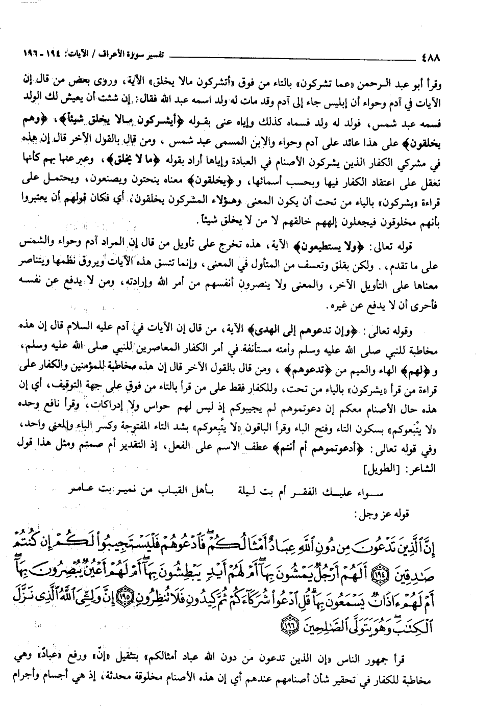 إِنَّ الَّذِينَ تَدْعُونَ مِنْ دُونِ اللَّهِ عِبادٌ أَمْثالُكُمْ فَادْعُوهُمْ فَلْيَسْتَجِيبُوا لَكُمْ إِنْ كُنْتُمْ صادِقِينَ (١٩٤) أَلَهُمْ أَرْجُلٌ يَمْشُونَ بِها أَمْ لَهُمْ أَيْدٍ يَبْطِشُونَ بِها أَمْ لَهُمْ أَعْيُنٌ يُبْصِرُونَ بِها أَمْ لَهُمْ آذانٌ يَسْمَعُونَ بِها قُلِ ادْعُوا شُرَكاءَكُمْ ثُمَّ كِيدُونِ فَلا تُنْظِرُونِ (١٩٥) إِنَّ وَلِيِّيَ اللَّهُ الَّذِي نَزَّلَ الْكِتابَ وَهُوَ يَتَوَلَّى الصَّالِحِينَ (١٩٦)