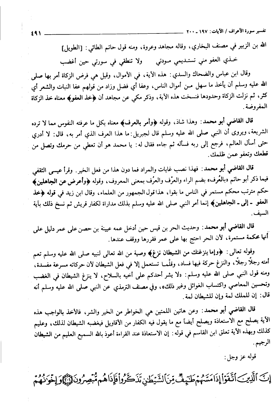 قال القاضي أبو محمد: وهذا شاذ، وقوله وَأْمُرْ بِالْعُرْفِ معناه بكل ما عرفته النفوس مما لا ترده الشريعة، ويروى أن النبي صلى الله عليه وسلم قال لجبريل: ما هذا العرف الذي أمر به، قال: لا أدري حتى أسأل العالم، فرجع إلى ربه فسأله ثم جاءه فقال له: يا محمد هو أن تعطي من حرمك وتصل من قطعك وتعفو عمن ظلمك.