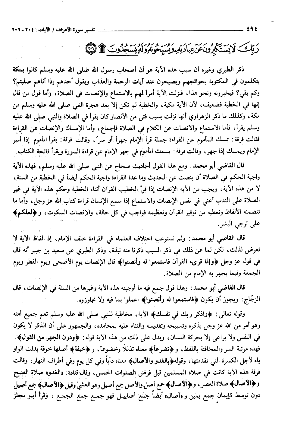 قال القاضي أبو محمد: ولم نستوعب اختلاف العلماء في القراءة خلف الإمام، إذ ألفاظ الآية لا تعرض لذلك، لكن لما عن ذلك في ذكر السبب ذكرنا منه نبذة، وذكر الطبري عن سعيد بن جبير أنه قال في قوله عز وجل وَإِذا قُرِئَ الْقُرْآنُ فَاسْتَمِعُوا لَهُ وَأَنْصِتُوا قال الإنصات يوم الأضحى ويوم الفطر ويوم الجمعة وفيما يجهر به الإمام من الصلاة.
