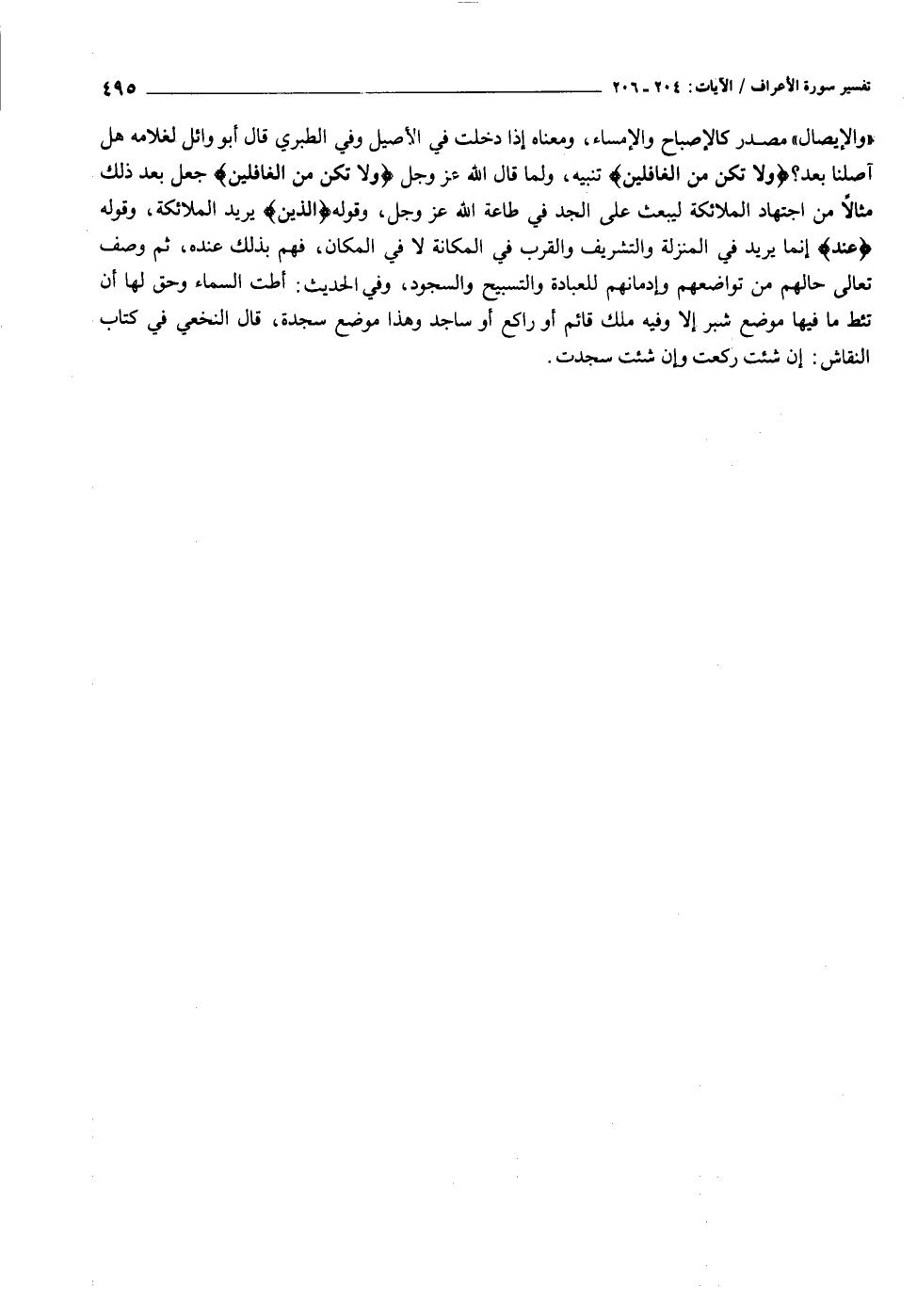 «والإيصال» مصدر كالإصباح والإمساء، ومعناه إذا دخلت في الأصيل وفي الطبري قال أبو وائل لغلامه هل آصلنا بعد؟ وَلا تَكُنْ مِنَ الْغافِلِينَ تنبيه، ولما قال الله عز وجل وَلا تَكُنْ مِنَ الْغافِلِينَ جعل بعد ذلك مثالا من اجتهاد الملائكة ليبعث على الجد في طاعة الله عز وجل، وقوله الَّذِينَ يريد الملائكة، وقوله عِنْدَ إنما يريد في المنزلة والتشريف والقرب في المكانة لا في المكان، فهم بذلك عنده، ثم وصف تعالى حالهم من تواضعهم وإدمانهم للعبادة والتسبيح والسجود، وفي الحديث: أطت السماء وحق لها أن تئط ما فيها موضع شبر إلا وفيه ملك قائم أو راكع أو ساجد وهذا موضع سجدة، قال النخعي في كتاب النقاش: إن شئت ركعت وإن شئت سجدت.