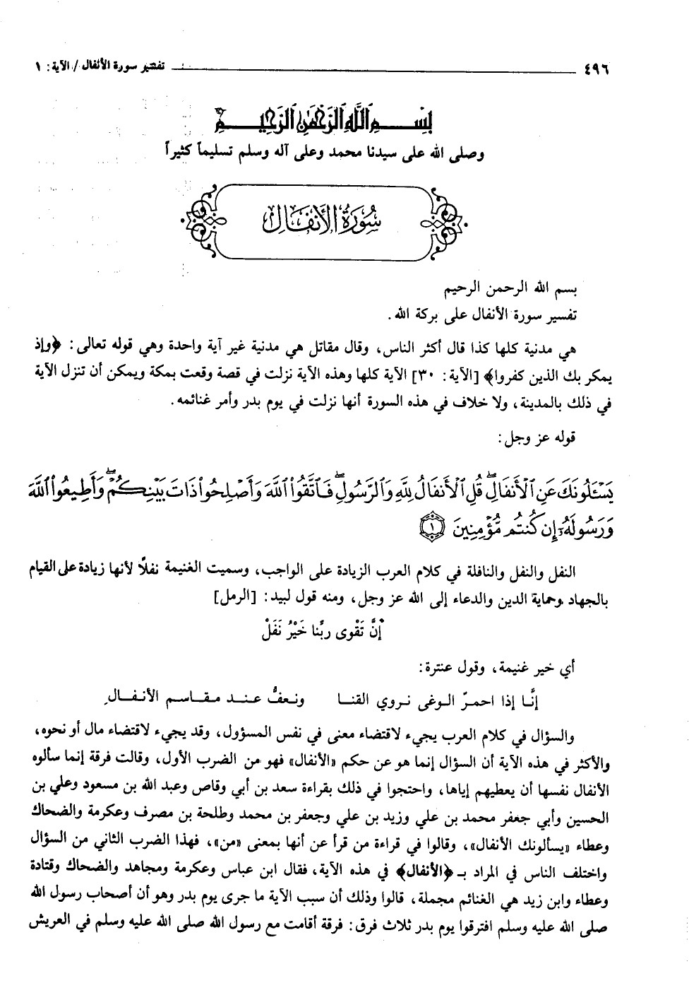 والسؤال في كلام العرب يجيء لاقتضاء معنى في نفس المسئول، وقد يجيء لاقتضاء مال أو نحوه، والأكثر في هذه الآية أن السؤال إنما هو عن حكم «الأنفال» فهو من الضرب الأول، وقالت فرقة إنما سألوه الأنفال نفسها أن يعطيهم إياها، واحتجوا في ذلك بقراءة سعد بن أبي وقاص وعبد الله بن مسعود وعلي بن الحسين وأبي جعفر محمد بن علي وزيد بن علي وجعفر بن محمد وطلحة بن مصرف وعكرمة والضحاك وعطاء «يسألونك الأنفال» ، وقالوا في قراءة من قرأ عن أنها بمعنى «من» ، فهذا الضرب الثاني من السؤال واختلف الناس في المراد ب الْأَنْفالِ في هذه الآية، فقال ابن عباس وعكرمة ومجاهد والضحاك وقتادة وعطاء وابن زيد هي الغنائم مجملة، قالوا وذلك أن سبب الآية ما جرى يوم بدر وهو أن أصحاب رسول الله صلى الله عليه وسلم افترقوا يوم بدر ثلاث فرق: فرقة أقامت مع رسول الله صلى الله عليه وسلم في العريش