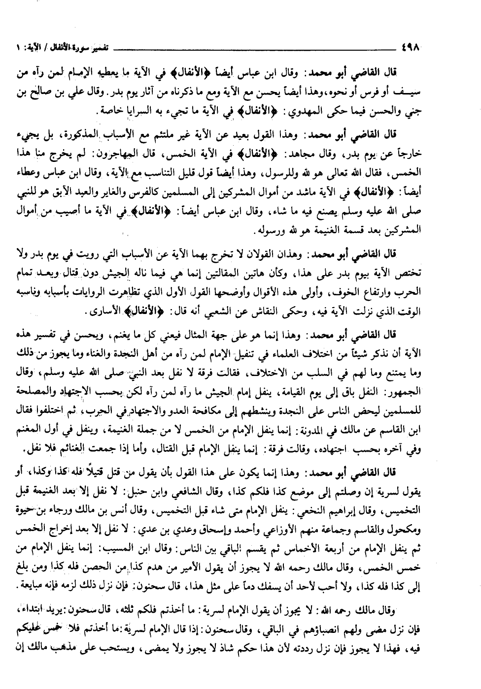 قال القاضي أبو محمد: وهذا إنما هو على جهة المثال فيعني كل ما يغنم، ويحسن في تفسير هذه الآية أن نذكر شيئا من اختلاف العلماء في تنفيل الإمام لمن رآه من أهل النجدة والغناء وما يجوز من ذلك وما يمتنع وما لهم في السلب من الاختلاف، فقالت فرقة لا نفل بعد النبي صلى الله عليه وسلم، وقال الجمهور: النفل باق إلى يوم القيامة، ينفل إمام الجيش ما رآه لمن رآه لكن بحسب الاجتهاد والمصلحة للمسلمين ليحض الناس على النجدة وينشطهم إلى مكافحة العدو والاجتهاد في الحرب، ثم اختلفوا فقال ابن القاسم عن مالك في المدونة: إنما ينفل الإمام من الخمس لا من جملة الغنيمة، وينفل في أول المغنم وفي آخره بحسب اجتهاده، وقالت فرقة: إنما ينفل الإمام قبل القتال، وأما إذا جمعت الغنائم فلا نفل.