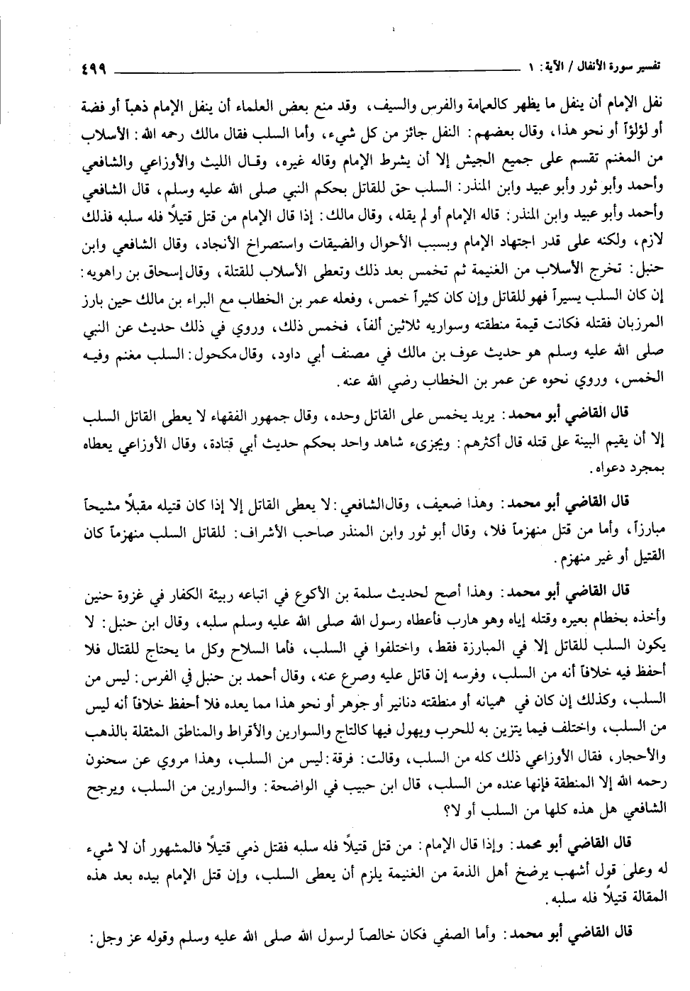 نفل الإمام أن ينفل ما يظهر كالعمامة والفرس والسيف، وقد منع بعض العلماء أن ينفل الإمام ذهبا أو فضة أو لؤلؤا أو نحو هذا، وقال بعضهم: النفل جائز من كل شيء، وأما السلب فقال مالك رحمه الله: الأسلاب من المغنم تقسم على جميع الجيش إلا أن يشرط الإمام وقاله غيره، وقال الليث والأوزاعي والشافعي وأحمد وأبو ثور وأبو عبيد وابن المنذر: السلب حق للقاتل بحكم النبي صلى الله عليه وسلم، قال الشافعي وأحمد وأبو عبيد وابن المنذر: قال الإمام أولم يقله، وقال مالك: إذا قال الإمام من قتل قتيلا فله سلبه فذلك لازم، ولكنه على قدر اجتهاد الإمام وبسبب الأحوال والضيقات واستصراخ الأنجاد، وقال الشافعي وابن حنبل: تخرج الأسلاب من الغنيمة ثم تخمس بعد ذلك وتعطى الأسلاب للقتلة، وقال إسحاق بن راهويه:
