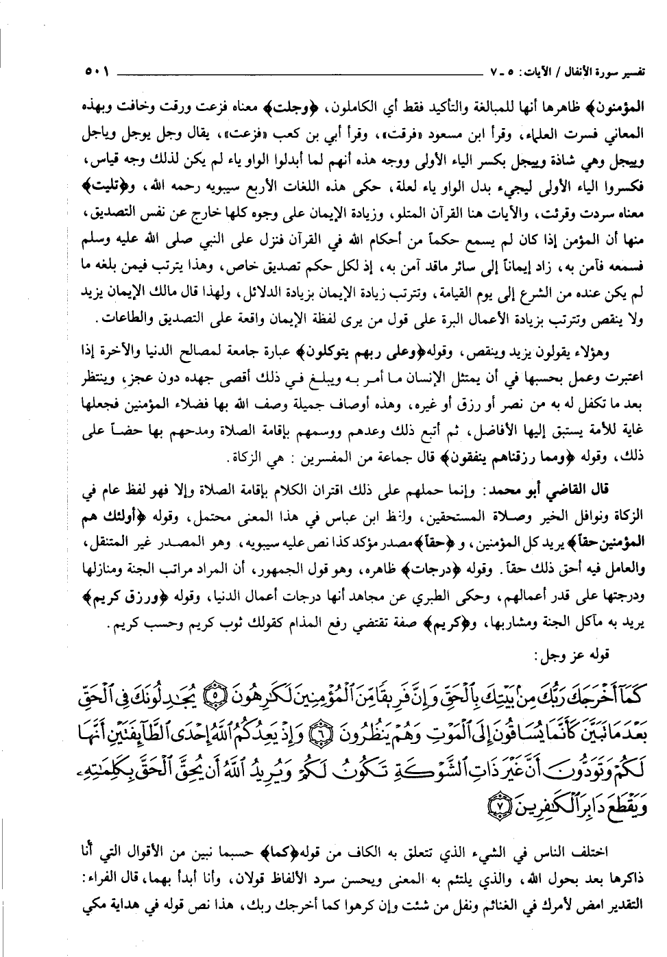 اختلف الناس في الشيء الذي تتعلق به الكاف من قوله كَما حسبما نبين من الأقوال التي أنا ذاكرها بعد بحول الله، والذي يلتئم به المعنى ويحسن سرد الألفاظ قولان، وأنا أبدأ بهما، قال الفراء: