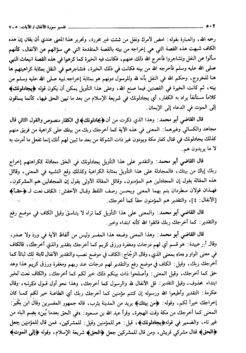 قال القاضي أبو محمد: والتقدير على هذا التأويل يجادلونك في الحق مجادلة ككراهتهم إخراج ربك إياك من بيتك، فالمجادلة على هذا التأويل بمثابة الكراهية وكذلك وقع التشبيه في المعنى، وقائل هذه المقالة يقول إن المجادلين هم المؤمنون، وقائل المقالة الأولى يقول إن المجادلين هم المشركون، فهذان قولان مطردان يتم بهما المعنى ويحسن رصف اللفظ وقال الأخفش: الكاف نعت ل حَقًّا [الأنفال: ٤] ، والتقدير هم المؤمنون حقا كما أخرجك.