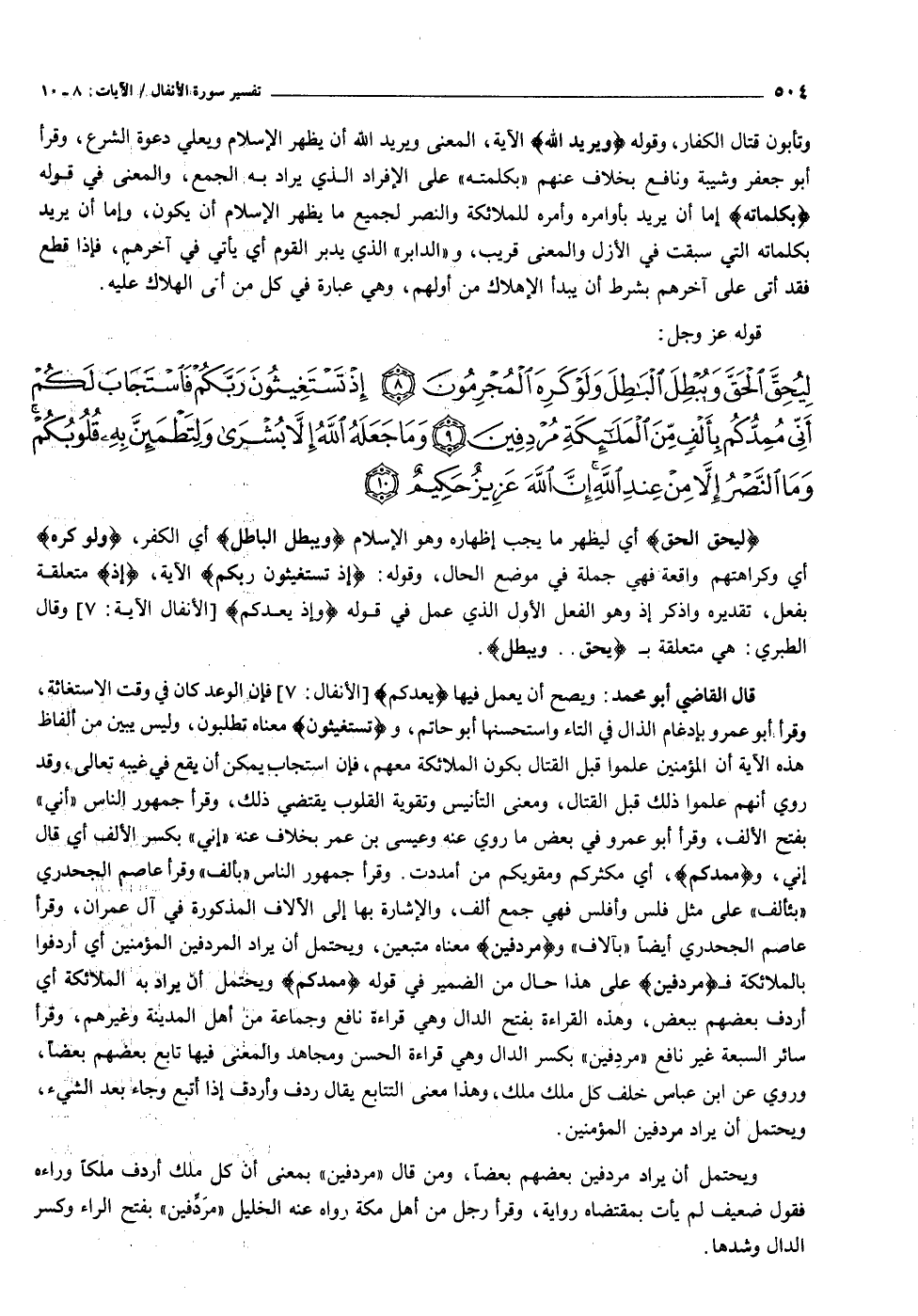 لِيُحِقَّ الْحَقَّ وَيُبْطِلَ الْباطِلَ وَلَوْ كَرِهَ الْمُجْرِمُونَ (٨) إِذْ تَسْتَغِيثُونَ رَبَّكُمْ فَاسْتَجابَ لَكُمْ أَنِّي مُمِدُّكُمْ بِأَلْفٍ مِنَ الْمَلائِكَةِ مُرْدِفِينَ (٩) وَما جَعَلَهُ اللَّهُ إِلاَّ بُشْرى وَلِتَطْمَئِنَّ بِهِ قُلُوبُكُمْ وَمَا النَّصْرُ إِلاَّ مِنْ عِنْدِ اللَّهِ إِنَّ اللَّهَ عَزِيزٌ حَكِيمٌ (١٠)