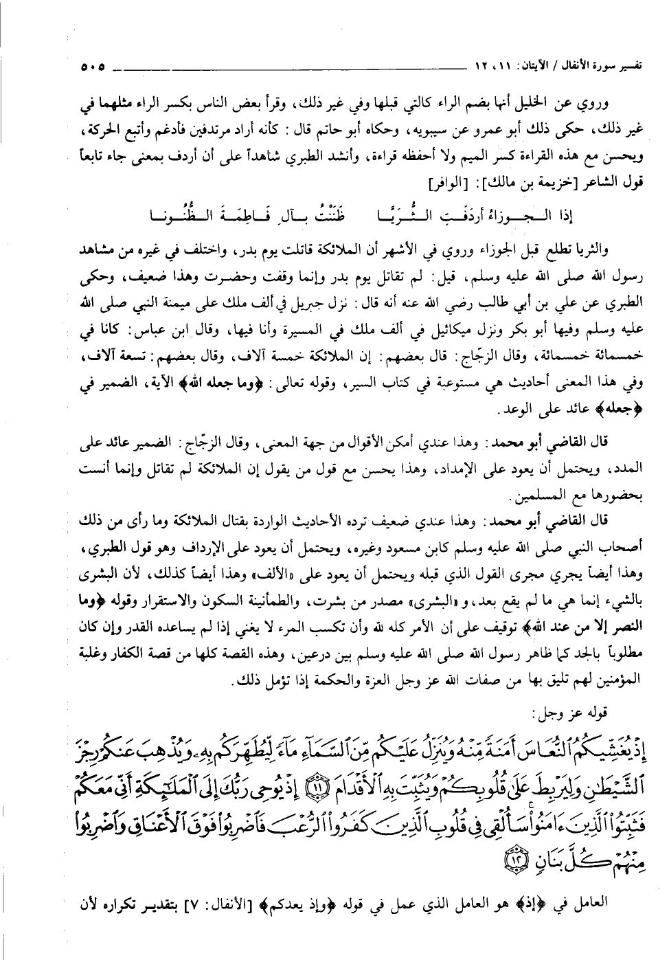 قال القاضي أبو محمد: وهذا عندي أمكن الأقوال من جهة المعنى، وقال الزجّاج: الضمير عائد على المدد، ويحتمل أن يعود على الإمداد، وهذا يحسن مع قول من يقول إن الملائكة لم تقاتل وإنما أنست بحضورها مع المسلمين.