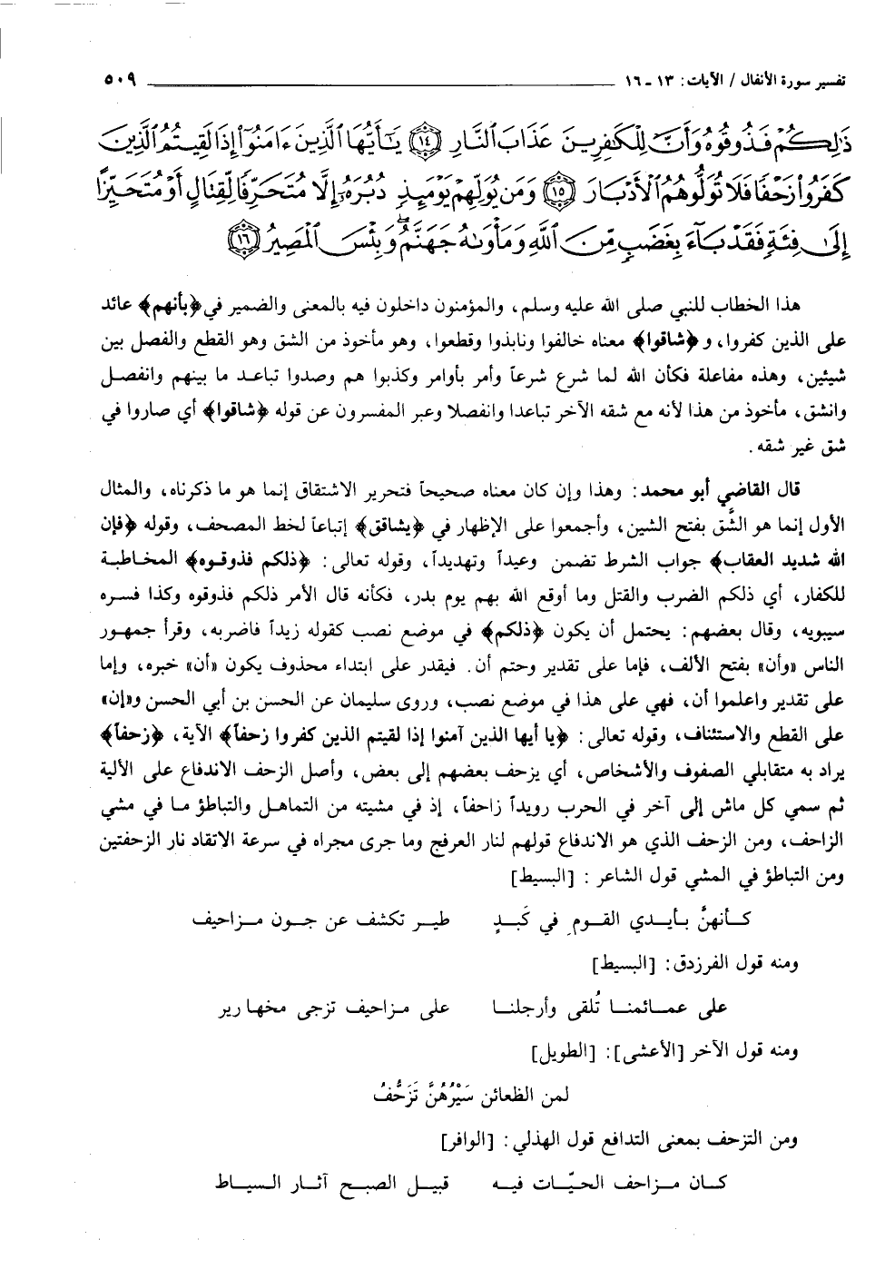 جواب الشرط تضمن وعيدا وتهديدا، وقوله تعالى: ذلِكُمْ فَذُوقُوهُ المخاطبة للكفار، أي ذلكم الضرب والقتل وما أوقع الله بهم يوم بدر، فكأنه قال الأمر ذلكم فذوقوه وكذا فسره سيبويه، وقال بعضهم: يحتمل أن يكون ذلِكُمْ في موضع نصب كقوله زيدا فاضربه، وقرأ جمهور الناس «وأن» بفتح الألف، فإما على تقدير وحتم أن. فيقدر على ابتداء محذوف يكون «أن» خبره، وإما على تقدير واعلموا أن، فهي على هذا في موضع نصب، وروى سليمان عن الحسن بن أبي الحسن و «إن» على القطع والاستئناف، وقوله تعالى: يا أَيُّهَا الَّذِينَ آمَنُوا إِذا لَقِيتُمُ الَّذِينَ كَفَرُوا زَحْفاً الآية، زَحْفاً يراد به متقابلي الصفوف والأشخاص، أي يزحف بعضهم إلى بعض، وأصل الزحف الاندفاع على الألية ثم سمي كل ماش إلى آخر في الحرب رويدا زاحفا، إذ في مشيته من التماهل والتباطؤ ما في مشي الزاحف، ومن الزحف الذي هو الاندفاع قولهم لنار العرفج وما جرى مجراه في سرعة الاتقاد نار الزحفتين ومن التباطؤ في المشي قول الشاعر: [البسيط]