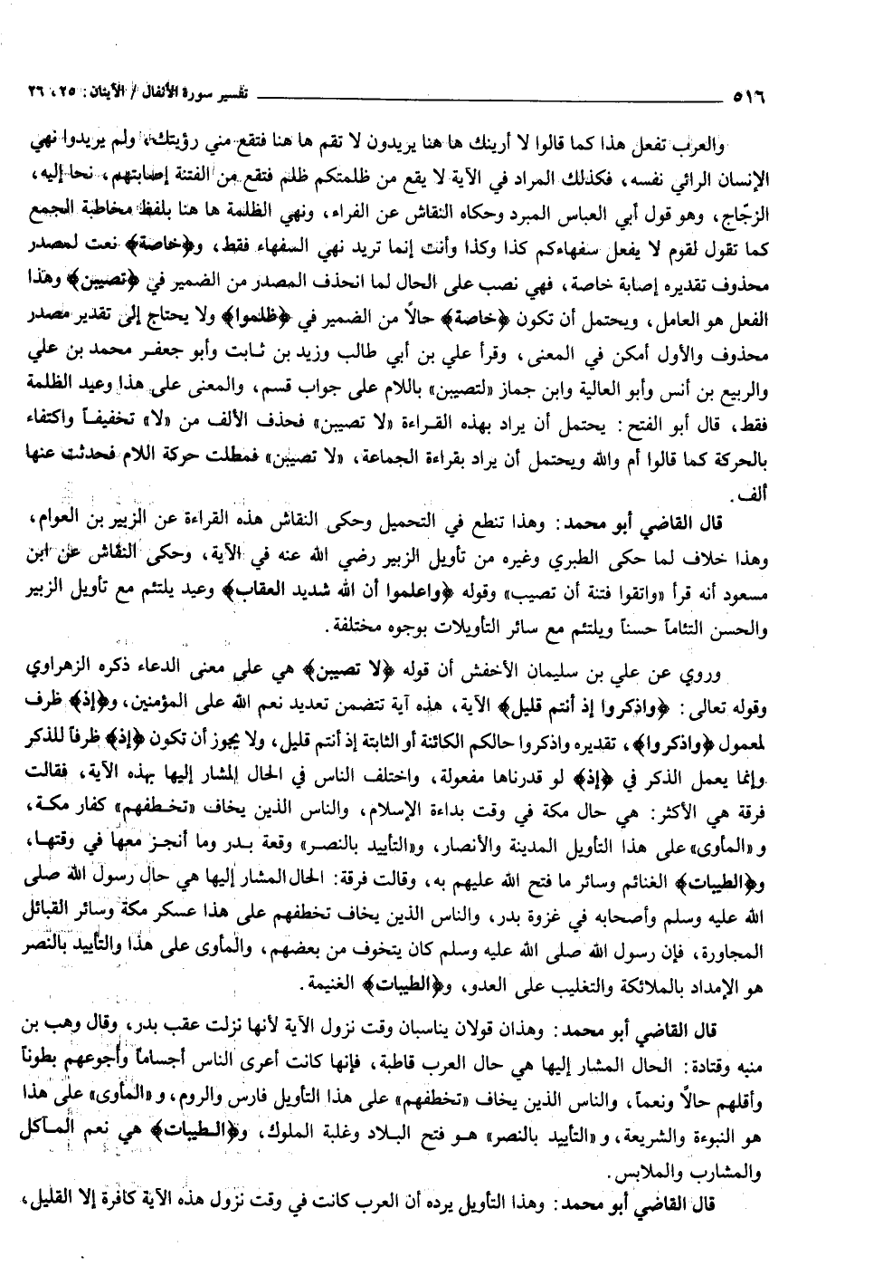 والعرب تفعل هذا كما قالوا لا أرينك هاهنا يريدون لا تقم هاهنا فتقع مني رؤيتك، ولم يريدوا نهي الإنسان الرائي نفسه، فكذلك المراد في الآية لا يقع من ظلمتكم ظلم فتقع من الفتنة إصابتهم، نحا إليه، الزجّاج، وهو قول أبي العباس المبرد وحكاه النقاش عن الفراء، ونهي الظلمة هاهنا بلفظ مخاطبة الجمع كما تقول لقوم لا يفعل سفهاءكم كذا وكذا وأنت إنما تريد نهي السفهاء فقط، وخَاصَّةً نعت لمصدر محذوف تقديره إصابة خاصة، فهي نصب على الحال لما انحذف المصدر من الضمير في تُصِيبَنَّ وهذا الفعل هو العامل، ويحتمل أن تكون خَاصَّةً حالا من الضمير في ظَلَمُوا ولا يحتاج إلى تقدير مصدر محذوف والأول أمكن في المعنى، وقرأ علي بن أبي طالب وزيد بن ثابت وأبو جعفر محمد بن علي والربيع بن أنس وأبو العالية وابن جماز «لتصيبن» باللام على جواب قسم، والمعنى على هذا وعيد الظلمة فقط، قال أبو الفتح: يحتمل أن يراد بهذه القراءة «لا تصيبن» فحذف الألف من «لا» تخفيفا واكتفاء بالحركة كما قالوا أم والله ويحتمل أن يراد بقراءة الجماعة، «لا تصيبن» فمطلت حركة اللام فحدثت عنها ألف.