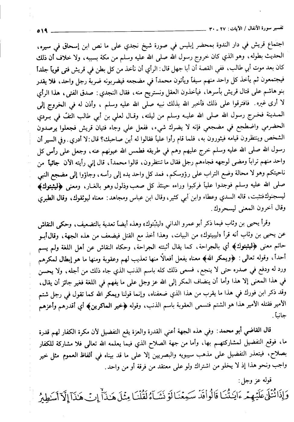 اجتماع قريش في دار الندوة بمحضر إبليس في صورة شيخ نجدي على ما نص ابن إسحاق في سيره، الحديث بطوله، وهو الذي كان خروج رسول الله صلى الله عليه وسلم من مكة بسببه، ولا خلاف أن ذلك كان بعد موت أبي طالب، ففي القصة أن أبا جهل قال: الرأي أن نأخذ من كل بطن في قريش فتى قويا جلدا فيجتمعون ثم يأخذ كل واحد منهم سيفا ويأتون محمدا في مضجعه فيضربونه ضربة رجل واحد، فلا يقدر بنو هاشم على قتال قريش بأسرها، فيأخذون العقل ونستريح منه، فقال النجدي: صدق الفتى، هذا الرأي لا أرى غيره. فافترقوا على ذلك فأخبر الله بذلك نبيه صلى الله عليه وسلم، وأذن له في الخروج إلى المدينة فخرج رسول الله صلى الله عليه وسلم من ليلته، وقال لعلي بن أبي طالب التفّ في بردي الحضرمي واضطجع في مضجعي فإنه لا يضرك شيء، ففعل علي وجاء فتيان قريش فجعلوا يرصدون الشخص وينتظرون قيامه فيثورون به، فلما قام رأوا عليا فقالوا له أين صاحبك؟ قال: لا أدري. وفي السير أن رسول الله صلى الله عليه وسلم خرج عليهم وهم في طريقه فطمس الله عيونهم عنه، وجعل على رأس كل واحد منهم ترابا ومضى لوجهه فجاءهم رجل فقال ما تنتظرون، قالوا محمدا، قال إني رأيته الآن جائيا من ناحيتكم وهو لا محالة وضع التراب على رؤوسكم، فمد كل واحد يده إلى رأسه، وجاؤوا إلى مضجع النبي صلى الله عليه وسلم فوجدوا عليا فركبوا وراءه حينئذ كل صعب وذلول وهو بالغار، ومعنى لِيُثْبِتُوكَ ليسجنوك فتثبت، قاله السدي وعطاء وابن أبي كثير، وقال ابن عباس ومجاهد: معناه ليوثقوك، وقال الطبري وقال آخرون المعنى ليسحروك.