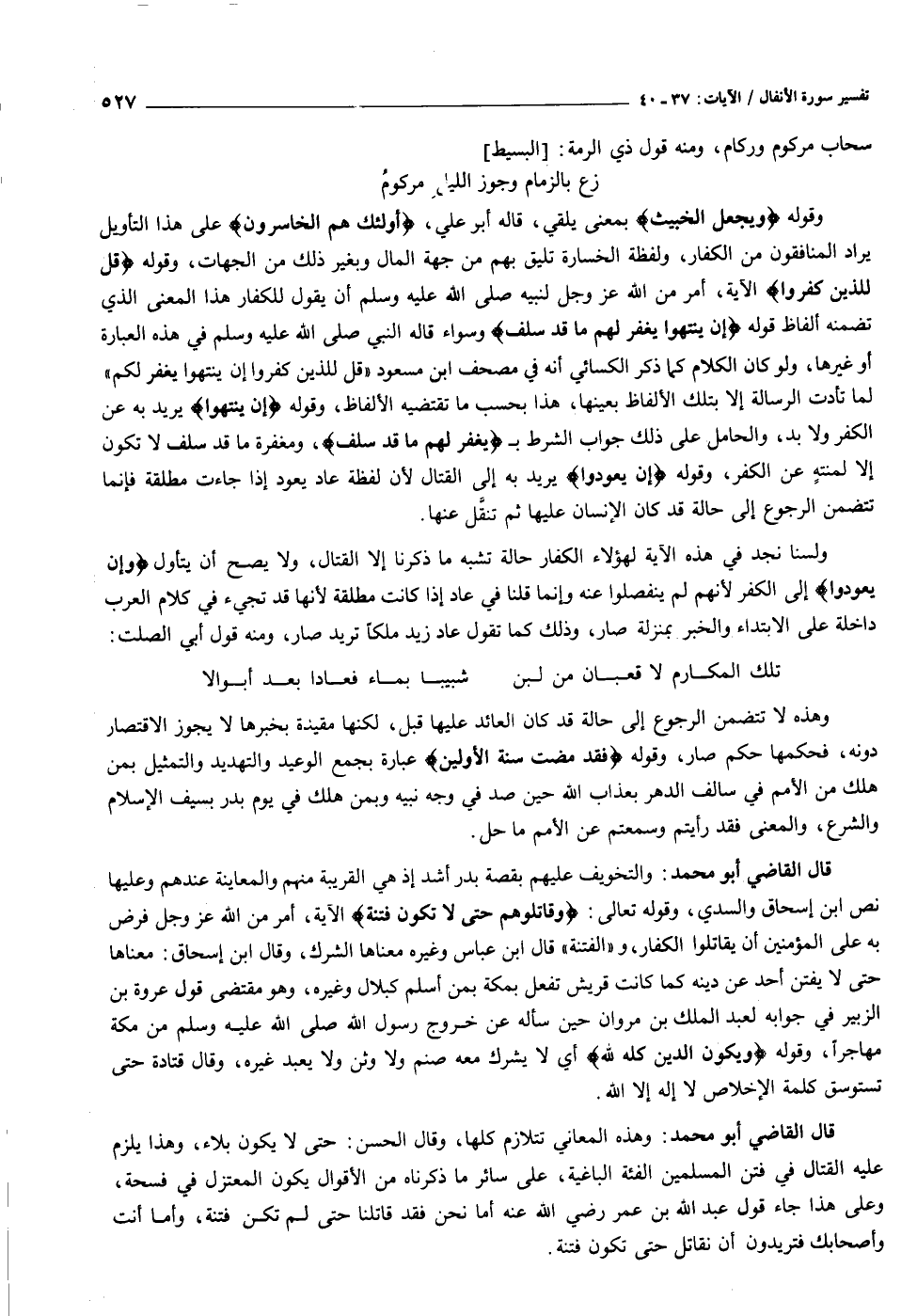 سحاب مركوم وركام، ومنه قول ذي الرمة: [البسيط] زع بالزمام وجوز الليل مركوم وقوله وَيَجْعَلَ الْخَبِيثَ بمعنى يلقي، قاله أبو علي، أُولئِكَ هُمُ الْخاسِرُونَ على هذا التأويل يراد المنافقون من الكفار، ولفظة الخسارة تليق بهم من جهة المال وبغير ذلك من الجهات، وقوله قُلْ لِلَّذِينَ كَفَرُوا الآية، أمر من الله عز وجل لنبيه صلى الله عليه وسلم أن يقول للكفار هذا المعنى الذي تضمنه ألفاظ قوله إِنْ يَنْتَهُوا يُغْفَرْ لَهُمْ ما قَدْ سَلَفَ وسواء قاله النبي صلى الله عليه وسلم في هذه العبارة أو غيرها، ولو كان الكلام كما ذكر الكسائي أنه في مصحف ابن مسعود «قل للذين كفروا إن ينتهوا يغفر لكم» لما تأدت الرسالة إلا بتلك الألفاظ بعينها، هذا بحسب ما تقتضيه الألفاظ، وقوله إِنْ يَنْتَهُوا يريد به عن الكفر ولا بد، والحامل على ذلك جواب الشرط ب يُغْفَرْ لَهُمْ ما قَدْ سَلَفَ، ومغفرة ما قد سلف لا تكون إلا لمنته عن الكفر، وقوله إِنْ يَعُودُوا يريد به إلى القتال لأن لفظة عاد يعود إذا جاءت مطلقة فإنما تتضمن الرجوع إلى حالة قد كان الإنسان عليها ثم تنقّل عنها.