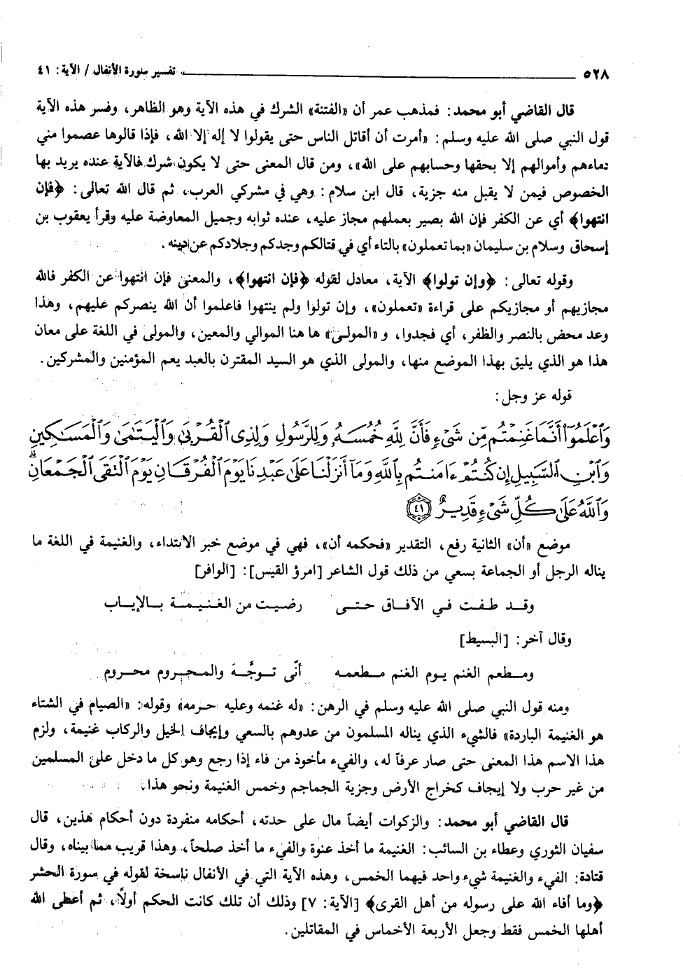 وَاعْلَمُوا أَنَّما غَنِمْتُمْ مِنْ شَيْءٍ فَأَنَّ لِلَّهِ خُمُسَهُ وَلِلرَّسُولِ وَلِذِي الْقُرْبى وَالْيَتامى وَالْمَساكِينِ وَابْنِ السَّبِيلِ إِنْ كُنْتُمْ آمَنْتُمْ بِاللَّهِ وَما أَنْزَلْنا عَلى عَبْدِنا يَوْمَ الْفُرْقانِ يَوْمَ الْتَقَى الْجَمْعانِ وَاللَّهُ عَلى كُلِّ شَيْءٍ قَدِيرٌ (٤١)