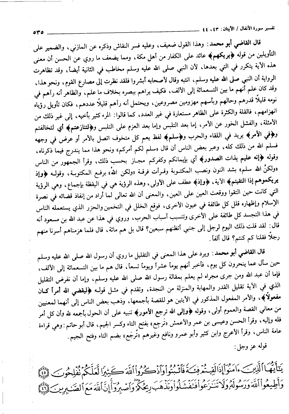 قال القاضي أبو محمد: وهذا القول ضعيف، وعليه فسر النقاش وذكره عن المازني، والضمير على التأويلين من قوله يُرِيكَهُمُ عائد على الكفار من أهل مكة، ومما يضعف ما روي عن الحسن أن معنى هذه الآية يتكرر في التي بعدها، لأن النبي صلى الله عليه وسلم مخاطب في الثانية أيضا، وقد تظاهرت الرواية أن النبي صلى الله عليه وسلم، انتبه وقال لأصحابه أبشروا فلقد نظرت إلى مصارع القوم، ونحو هذا، وقد كان علم أنهم ما بين التسعمائة إلى الألف، فكيف يراهم ببصره بخلاف ما علم، والظاهر أنه رآهم في نومه قليلا قدرهم وحالهم وبأسهم مهزومين مصروعين، ويحتمل أنه رآهم قليلا عددهم، فكان تأويل رؤياه انهزامهم، فالقلة والكثرة على الظاهر مستعارة في غير العدد، كما قالوا: المرء كثير بأخيه، إلى غير ذلك من الأمثلة، والفشل الخور عن الأمر، إما بعد التلبس وإما بعد العزم على التلبس ولَتَنازَعْتُمْ أي لتخالفتم وفِي الْأَمْرِ يريد في اللقاء والحرب وسَلَّمَ لفظ يعم كل متخوف اتصل بالأمر أو عرض في وجهه فسلم الله من ذلك كله، وعبر بعض الناس أن قال «سلم لكم أمركم» ونحو هذا مما يندرج فيما ذكرناه، وقوله إِنَّهُ عَلِيمٌ بِذاتِ الصُّدُورِ أي بإيمانكم وكفركم مجاز بحسب ذلك، وقرأ الجمهور من الناس «ولكنّ الله سلم» بشد النون ونصب المكتوبة وقرأت فرقة «ولكن الله» برفع المكتوبة، وقوله وَإِذْ يُرِيكُمُوهُمْ إِذِ الْتَقَيْتُمْ الآية، وَإِذْ عطف على الأولى، وهذه الرؤية هي في اليقظة بإجماع، وهي الرؤية التي كانت حين التقوا ووقعت العين على العين، والمعنى أن الله تعالى لما أراد من إنفاذ قضائه في نصرة الإسلام وإظهاره قلل كل طائفة في عيون الأخرى، فوقع الخلل في التخمين والحزر الذي يستعمله الناس في هذا التجسد كل طائفة على الأخرى وتتسبب أسباب الحرب، وروي في هذا عن عبد الله بن مسعود أنه قال: لقد قلت ذلك اليوم لرجل إلى جنبي أتظنهم سبعين؟ قال بل هم مائة، قال فلما هزمناهم أسرنا منهم رجلا فقلنا كم كنتم؟ قال ألفا.