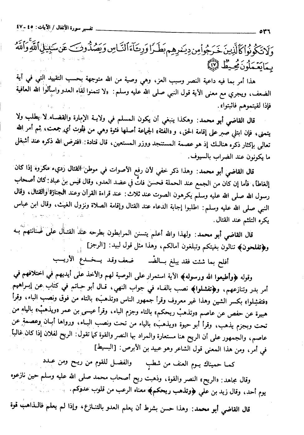 وقوله وَأَطِيعُوا اللَّهَ وَرَسُولَهُ الآية استمرار على الوصية لهم والأخذ على أيديهم في اختلافهم في أمر بدر وتنازعهم، وفَتَفْشَلُوا نصب بالفاء في جواب النهي، قال أبو حاتم في كتاب عن إبراهيم «فتفشلوا» بكسر الشين وهذا غير معروف وقرأ جمهور الناس «وتذهب» بالتاء من فوق ونصب الباء، وقرأ هبيرة عن حفص عن عاصم «وتذهب ريحكم» بالتاء وجزم الباء، وقرأ عيسى بن عمر «ويذهب» بالياء من تحت وبجزم يذهب، وقرأ أبو حيوة «ويذهب» بالياء من تحت ونصب الباء، ورواها أبان وعصمة عن عاصم، والجمهور على أن الريح هنا مستعارة والمراد بها النصر والقوة كما تقول: الريح لفلان إذا كان غالبا في أمر، ومن هذا المعنى قول الشاعر وهو عبيد بن الأبرص: [البسيط]