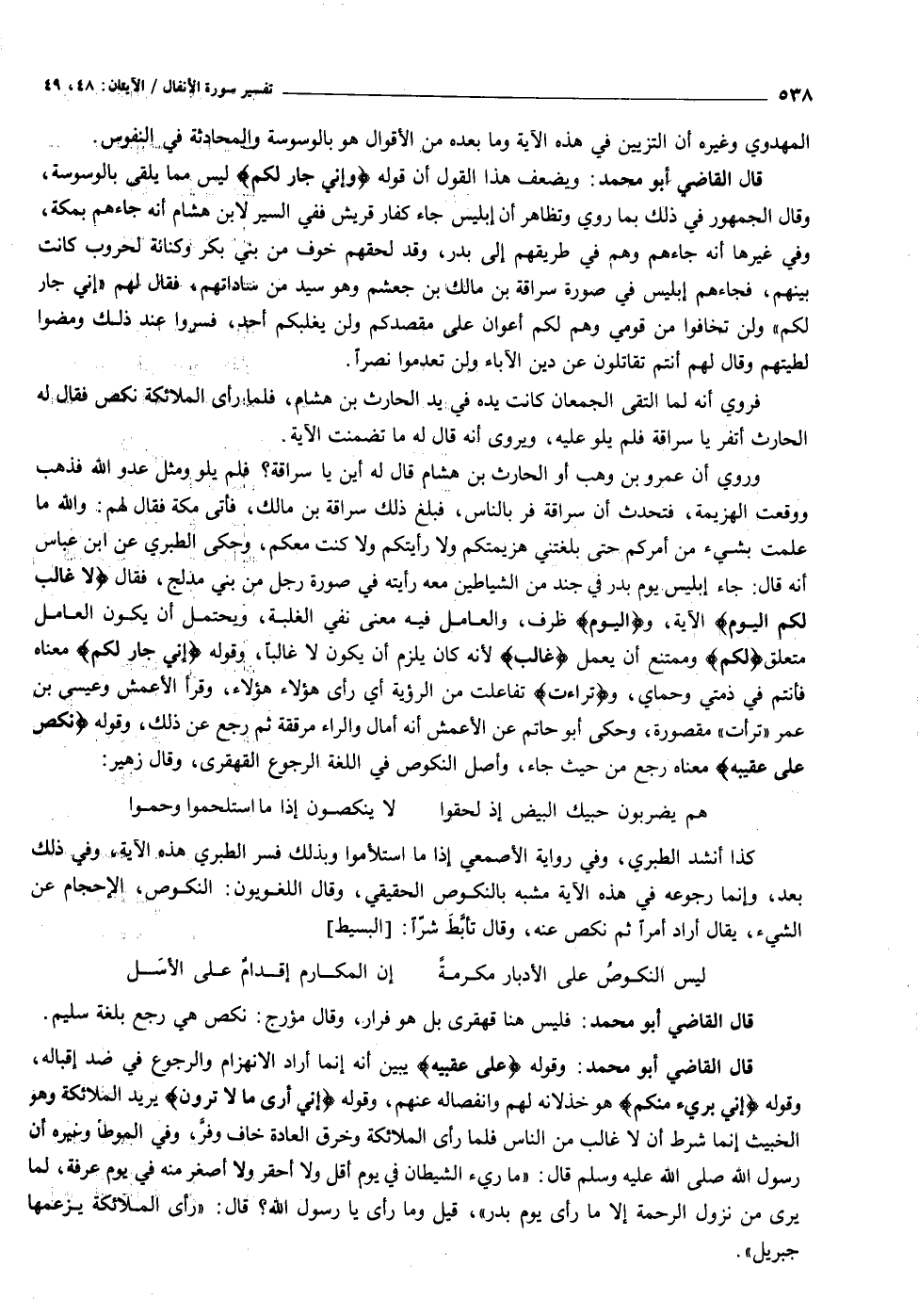 قال القاضي أبو محمد: وقوله عَلى عَقِبَيْهِ يبين أنه إنما أراد الانهزام والرجوع في ضد إقباله، وقوله إِنِّي بَرِيءٌ مِنْكُمْ هو خذلانه لهم وانفصاله عنهم، وقوله إِنِّي أَرى ما لا تَرَوْنَ يريد الملائكة وهو الخبيث إنما شرط أن لا غالب من الناس فلما رأى الملائكة وخرق العادة خاف وفرّ، وفي الموطإ وغيره أن رسول الله صلى الله عليه وسلم قال: «ما ريء الشيطان في يوم أقل ولا أحقر ولا أصغر منه في يوم عرفة، لما يرى من نزول الرحمة إلا ما رأى يوم بدر» ، قيل وما رأى يا رسول الله؟ قال: «رأى الملائكة يزعمها جبريل» .