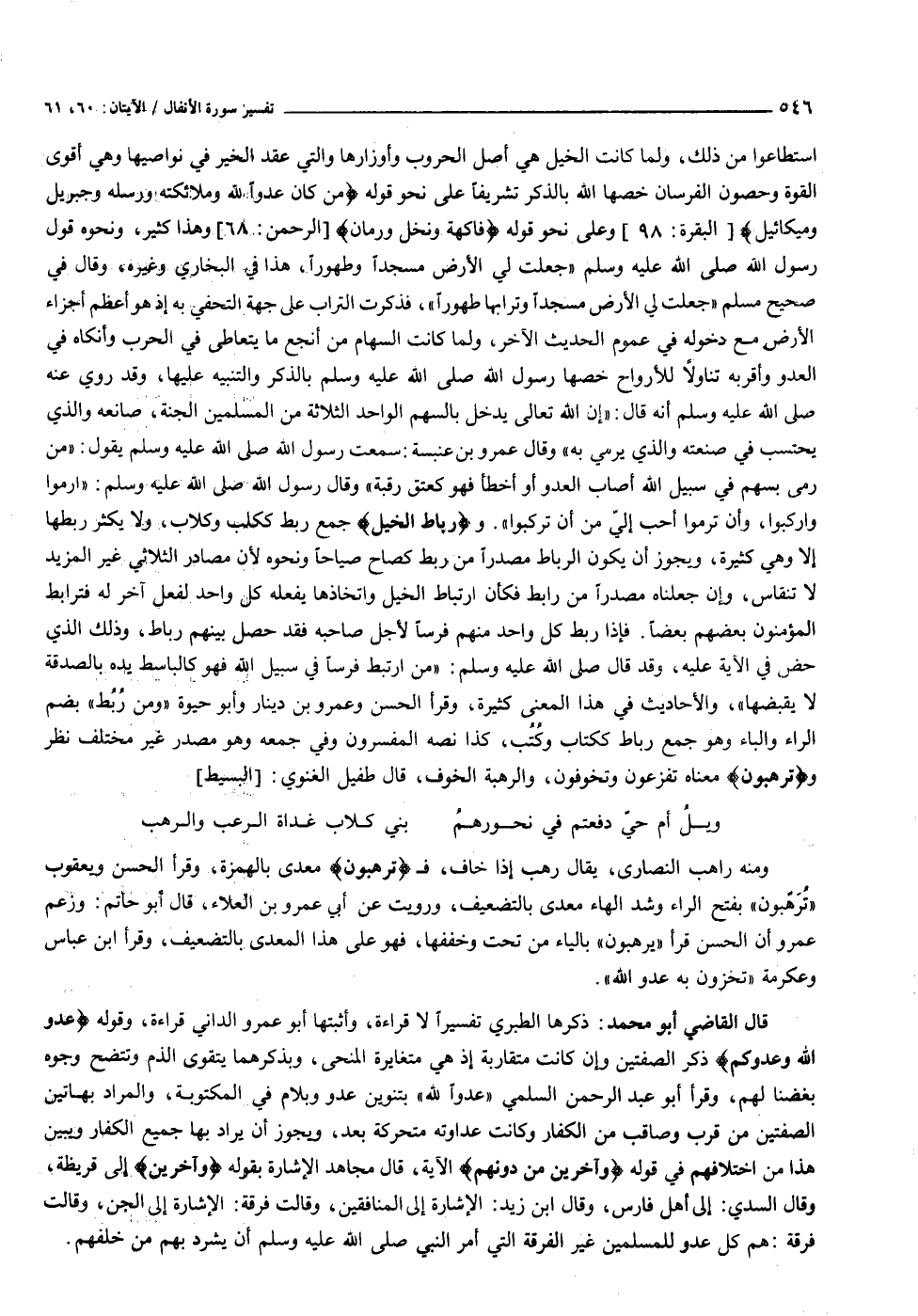 استطاعوا من ذلك، ولما كانت الخيل هي أصل الحروب وأوزارها والتي عقد الخير في نواصيها وهي أقوى القوة وحصون الفرسان خصها الله بالذكر تشريفا على نحو قوله مَنْ كانَ عَدُوًّا لِلَّهِ وَمَلائِكَتِهِ وَرُسُلِهِ وَجِبْرِيلَ وَمِيكالَ [البقرة: ٩٨] وعلى نحو قوله فاكِهَةٌ وَنَخْلٌ وَرُمَّانٌ [الرحمن: ٦٨] وهذا كثير، ونحوه قول رسول الله صلى الله عليه وسلم «جعلت لي الأرض مسجدا وطهورا، هذا في البخاري وغيره، وقال في صحيح مسلم «جعلت لي الأرض مسجدا وترابها طهورا» ، فذكرت التراب على جهة التحفي به إذ هو أعظم أجزاء الأرض مع دخوله في عموم الحديث الآخر، ولما كانت السهام من أنجع ما يتعاطى في الحرب وأنكاه في العدو وأقربه تناولا للأرواح خصها رسول الله صلى الله عليه وسلم بالذكر والتنبيه عليها، وقد روي عنه صلى الله عليه وسلم أنه قال: «إن الله تعالى يدخل بالسهم الواحد الثلاثة من المسلمين الجنة، صانعه والذي يحتسب في صنعته والذي يرمي به» وقال عمرو بن عنبسة: سمعت رسول الله صلى الله عليه وسلم يقول: «من رمى بسهم في سبيل الله أصاب العدو أو أخطأ فهو كعتق رقبة» وقال رسول الله صلى الله عليه وسلم: «ارموا واركبوا، وأن ترموا أحب إليّ من أن تركبوا» . ورِباطِ الْخَيْلِ جمع ربط ككلب وكلاب، ولا يكثر ربطها إلا وهي كثيرة، ويجوز أن يكون الرباط مصدرا من ربط كصاح صياحا ونحوه لأن مصادر الثلاثي غير المزيد لا تنقاس، وإن جعلناه مصدرا من رابط فكأن ارتباط الخيل واتخاذها يفعله كل واحد لفعل آخر له فترابط المؤمنون بعضهم بعضا. فإذا ربط كل واحد منهم فرسا لأجل صاحبه فقد حصل بينهم رباط، وذلك الذي حض في الآية عليه، وقد قال صلى الله عليه وسلم: «من ارتبط فرسا في سبيل الله فهو كالباسط يده بالصدقة لا يقبضها» ، والأحاديث في هذا المعنى كثيرة، وقرأ الحسن وعمرو بن دينار وأبو حيوة «ومن ربط» بضم الراء والباء وهو جمع رباط ككتاب وكتب، كذا نصه المفسرون وفي جمعه وهو مصدر غير مختلف نظر وتُرْهِبُونَ معناه تفزعون وتخوفون، والرهبة الخوف، قال طفيل الغنوي: [البسيط]