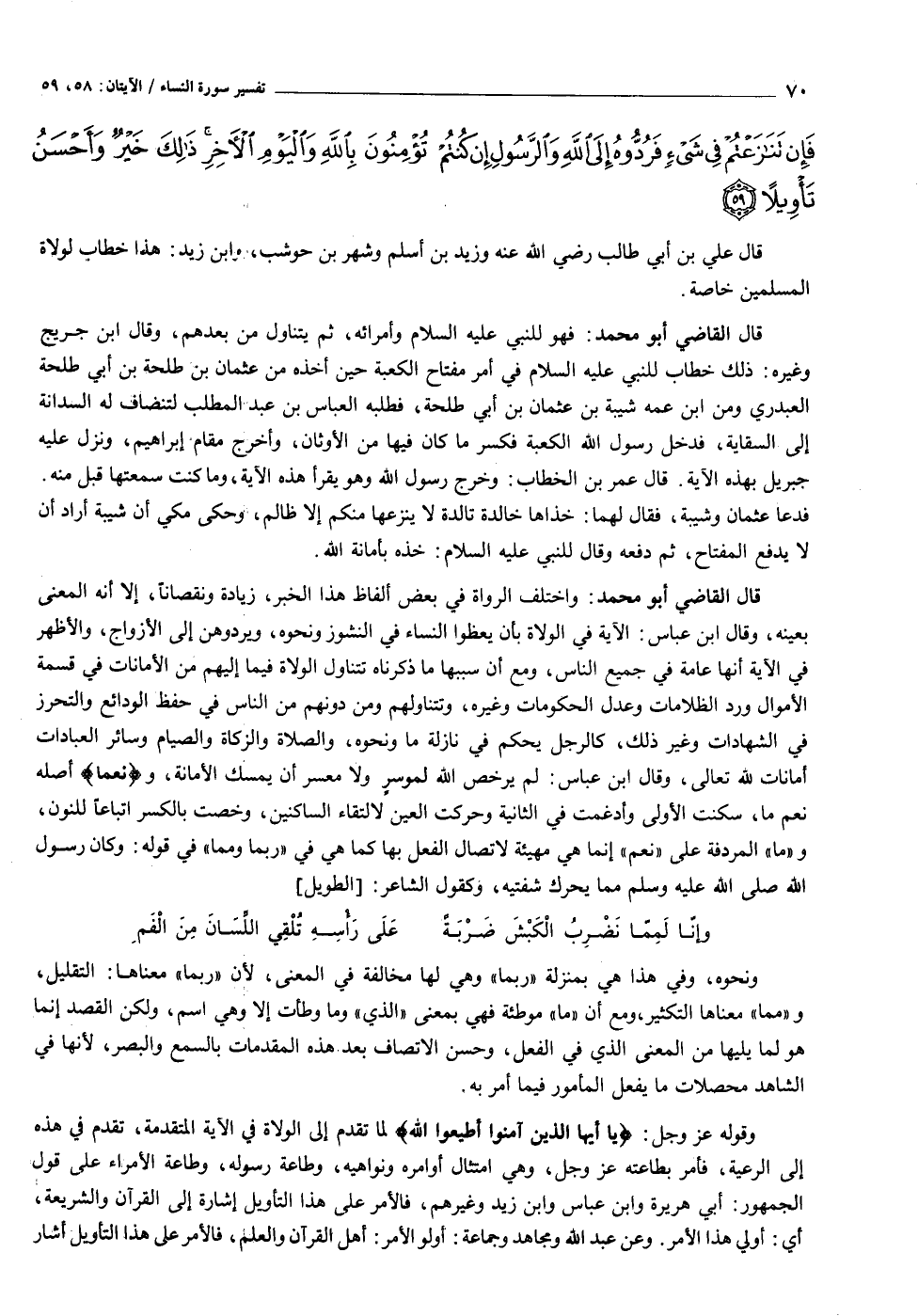 قال القاضي أبو محمد: واختلف الرواة في بعض ألفاظ هذا الخبر، زيادة ونقصانا، إلا أنه المعنى بعينه، وقال ابن عباس: الآية في الولاة بأن يعظوا النساء في النشوز ونحوه، ويردوهن إلى الأزواج، والأظهر في الآية أنها عامة في جميع الناس، ومع أن سببها ما ذكرناه تتناول الولاة فيما إليهم من الأمانات في قسمة الأموال ورد الظلامات وعدل الحكومات وغيره، وتتناولهم ومن دونهم من الناس في حفظ الودائع والتحرز في الشهادات وغير ذلك، كالرجل يحكم في نازلة ما ونحوه، والصلاة والزكاة والصيام وسائر العبادات أمانات لله تعالى، وقال ابن عباس: لم يرخص الله لموسر ولا معسر أن يمسك الأمانة، ونِعِمَّا أصله نعم ما، سكنت الأولى وأدغمت في الثانية وحركت العين لالتقاء الساكنين، وخصت بالكسر اتباعا للنون، و «ما» المردفة على «نعم» إنما هي مهيئة لاتصال الفعل بها كما هي في «ربما ومما» في قوله: وكان رسول الله صلى الله عليه وسلم مما يحرك شفتيه، وكقول الشاعر: [الطويل]