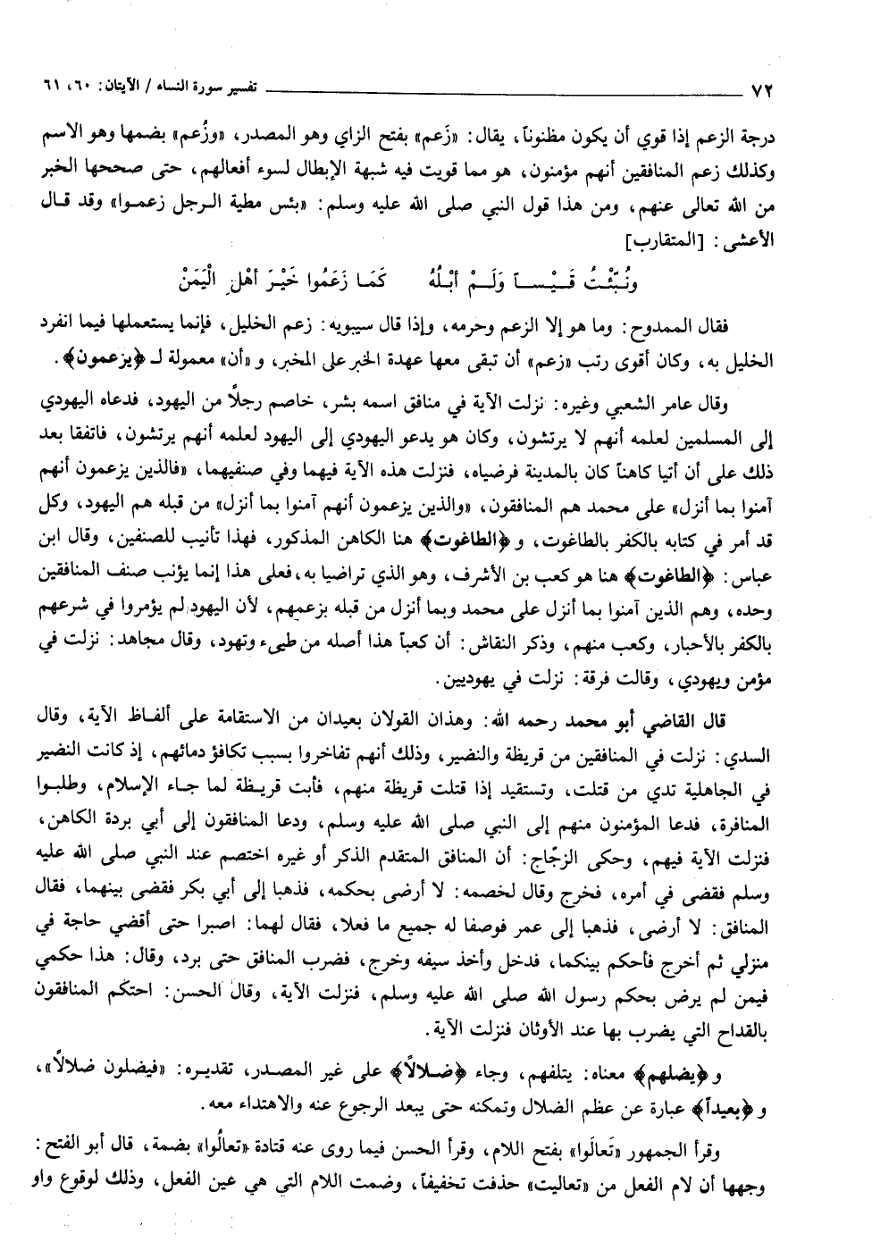 وقال عامر الشعبي وغيره: نزلت الآية في منافق اسمه بشر، خاصم رجلا من اليهود، فدعاه اليهودي إلى المسلمين لعلمه أنهم لا يرتشون، وكان هو يدعو اليهودي إلى اليهود لعلمه أنهم يرتشون، فاتفقا بعد ذلك على أن أتيا كاهنا كان بالمدينة فرضياه، فنزلت هذه الآية فيهما وفي صنفيهما، «فالذين يزعمون أنهم آمنوا بما أنزل» على محمد هم المنافقون، «والذين يزعمون أنهم آمنوا بما أنزل» من قبله هم اليهود، وكل قد أمر في كتابه بالكفر بالطاغوت، والطَّاغُوتِ هنا الكاهن المذكور، فهذا تأنيب للصنفين، وقال ابن عباس: الطَّاغُوتِ هنا هو كعب بن الأشرف، وهو الذي تراضيا به، فعلى هذا إنما يؤنب صنف المنافقين وحده، وهم الذين آمنوا بما أنزل على محمد وبما أنزل من قبله بزعمهم، لأن اليهود لم يؤمروا في شرعهم بالكفر بالأحبار، وكعب منهم، وذكر النقاش: أن كعبا هذا أصله من طيىء وتهود، وقال مجاهد: نزلت في مؤمن ويهودي، وقالت فرقة: نزلت في يهوديين.