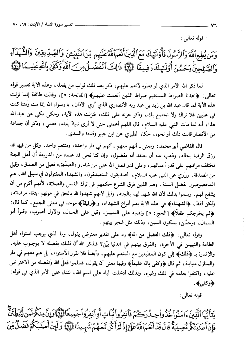 وَمَنْ يُطِعِ اللَّهَ وَالرَّسُولَ فَأُولئِكَ مَعَ الَّذِينَ أَنْعَمَ اللَّهُ عَلَيْهِمْ مِنَ النَّبِيِّينَ وَالصِّدِّيقِينَ وَالشُّهَداءِ وَالصَّالِحِينَ وَحَسُنَ أُولئِكَ رَفِيقاً (٦٩) ذلِكَ الْفَضْلُ مِنَ اللَّهِ وَكَفى بِاللَّهِ عَلِيماً (٧٠)