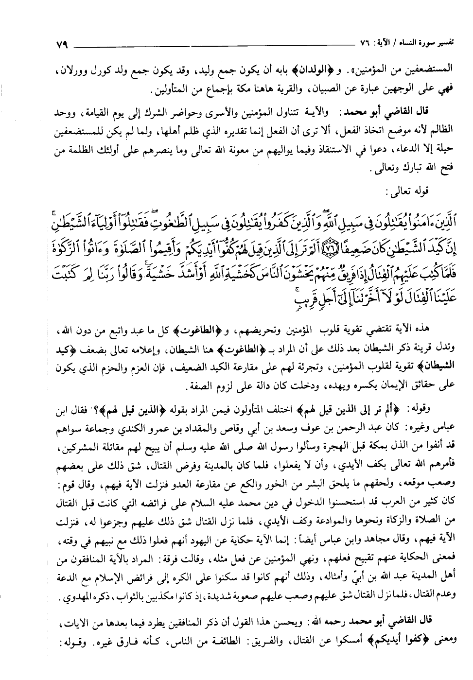 الَّذِينَ آمَنُوا يُقاتِلُونَ فِي سَبِيلِ اللَّهِ وَالَّذِينَ كَفَرُوا يُقاتِلُونَ فِي سَبِيلِ الطَّاغُوتِ فَقاتِلُوا أَوْلِياءَ الشَّيْطانِ إِنَّ كَيْدَ الشَّيْطانِ كانَ ضَعِيفاً (٧٦) أَلَمْ تَرَ إِلَى الَّذِينَ قِيلَ لَهُمْ كُفُّوا أَيْدِيَكُمْ وَأَقِيمُوا الصَّلاةَ وَآتُوا الزَّكاةَ فَلَمَّا كُتِبَ عَلَيْهِمُ الْقِتالُ إِذا فَرِيقٌ مِنْهُمْ يَخْشَوْنَ النَّاسَ كَخَشْيَةِ اللَّهِ أَوْ أَشَدَّ خَشْيَةً وَقالُوا رَبَّنا لِمَ كَتَبْتَ عَلَيْنَا الْقِتالَ لَوْلا أَخَّرْتَنا إِلى أَجَلٍ قَرِيبٍ قُلْ مَتاعُ الدُّنْيا قَلِيلٌ وَالْآخِرَةُ خَيْرٌ لِمَنِ اتَّقى وَلا تُظْلَمُونَ فَتِيلاً (٧٧)