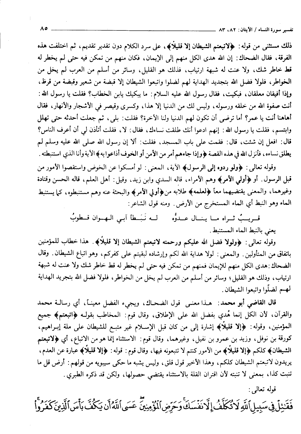 قال القاضي أبو محمد: هذا معنى قول الضحاك، ويجيء الفضل معينا، أي رسالة محمد والقرآن، لأن الكل إنما هدي بفضل الله على الإطلاق، وقال قوم: المخاطب بقوله لَاتَّبَعْتُمُ جميع المؤمنين، وقوله: إِلَّا قَلِيلًا إشارة إلى من كان قبل الإسلام غير متبع للشيطان على ملة إبراهيم، كورقة بن نوفل، وزيد بن عمرو بن نفيل، وغيرهما، وقال قوم: الاستثناء إنما هو من الاتباع، أي لَاتَّبَعْتُمُ الشَّيْطانَ كلكم إِلَّا قَلِيلًا من الأمور كنتم لا تتبعونه فيها، وقال قوم: قوله: إِلَّا قَلِيلًا عبارة عن العدم، يريدون لاتبعتم الشيطان كلكم، وهذا الأخير قول قلق، وليس يشبه ما حكى سيبويه من قولهم: أرض قل ما تنبت كذا، بمعنى لا تنبته لأن اقتران القلة بالاستثناء يقتضي حصولها، ولكن قد ذكره الطبري.