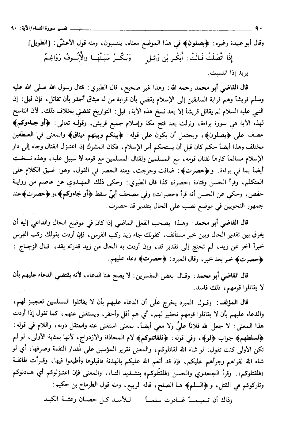 قال القاضي أبو محمد رحمه الله: وهذا غير صحيح، قال الطبري: قتال رسول الله صلى الله عليه وسلم قريشا وهم قرابة السابقين إلى الإسلام يقضي بأن قرابة من له ميثاق أجدر بأن تقاتل، فإن قيل: إن النبي عليه السلام لم يقاتل قريشا إلا بعد نسخ هذه الآية، قيل: التواريخ تقضي بخلاف ذلك، لأن الناسخ لهذه الآية هي سورة براءة، ونزلت بعد فتح مكة وإسلام جميع قريش، وقوله تعالى: أَوْ جاؤُكُمْ عطف على يَصِلُونَ، ويحتمل أن يكون على قوله: بَيْنَكُمْ وَبَيْنَهُمْ مِيثاقٌ والمعنى في العطفين مختلف وهذا أيضا حكم كان قبل أن يستحكم أمر الإسلام، فكان المشرك إذا اعتزل القتال وجاء إلى دار الإسلام مسالما كارها لقتال قومه، مع المسلمين ولقتال المسلمين مع قومه لا سبيل عليه، وهذه نسخت أيضا بما في براءة. وحَصِرَتْ: ضاقت وحرجت، ومنه الحصر في القول، وهو: ضيق الكلام على المتكلم، وقرأ الحسن وقتادة «حصرة» كذا قال الطبري: وحكى ذلك المهدوي عن عاصم من رواية حفص، وحكي عن الحسن أنه قرأ «حصرات» وفي مصحف أبيّ سقط أَوْ جاؤُكُمْ، وحَصِرَتْ عند جمهور النحويين في موضع نصب على الحال بتقدير قد حصرت.