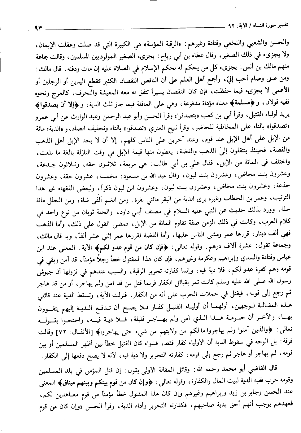 ومن صلى وصام أحب إليّ، وأجمع أهل العلم على أن الناقص النقصان الكثير كقطع اليدين أو الرجلين أو الأعمى لا يجزىء فيما حفظت، فإن كان النقصان يسيرا تتفق له معه المعيشة والتحرف، كالعرج ونحوه ففيه قولان، ومُسَلَّمَةٌ معناه مؤداة مدفوعة، وهي على العاقلة فيما جاز ثلث الدية، وإِلَّا أَنْ يَصَّدَّقُوا يريد أولياء القتيل، وقرأ أبي بن كعب «يتصدقوا» وقرأ الحسن وأبو عبد الرحمن وعبد الوارث عن أبي عمرو «تصدقوا» بالتاء على المخاطبة للحاضر، وقرأ نبيح العتري «تصدقوا» بالتاء وتخفيف الصاد، و «الدية» مائة من الإبل على أهل الإبل عند قوم، وعند آخرين على الناس كلهم، إلا أن لا يجد الإبل أهل الذهب والفضة، فحينئذ ينتقلون إلى الذهب والفضة، يعطون منها قيمة الإبل في وقت النازلة بالغة ما بلغت، واختلف في المائة من الإبل، فقال علي بن أبي طالب: هي مربعة، ثلاثون حقة، وثلاثون جذعة، وعشرون بنت مخاض، وعشرون بنت لبون، وقال عبد الله بن مسعود: مخمسة، عشرون حقة، وعشرون جذعة، وعشرون بنت مخاض، وعشرون بنت لبون، وعشرون ابن لبون ذكرا، ولبعض الفقهاء غير هذا الترتيب، وعمر بن الخطاب وغيره يرى الدية من البقر مائتي بقرة. ومن الغنم ألفي شاة، ومن الحلل مائة حلة، وورد بذلك حديث عن النبي عليه السلام في مصنف أبي داود، والحلة ثوبان من نوع واحد في كلام العرب، وكانت في ذلك الزمن صفة تقاوم المائة من الإبل، فمضى القول على ذلك، وأما الذهب فهي ألف دينار، قررها عمر ومشى الناس عليها، وأما الفضة فقررها عمر اثني عشر ألفا، وبه قال مالك، وجماعة تقول: عشرة آلاف درهم. وقوله تعالى: فَإِنْ كانَ مِنْ قَوْمٍ عَدُوٍّ لَكُمْ الآية. المعنى عند ابن عباس وقتادة والسدي وإبراهيم وعكرمة وغيرهم، فإن كان هذا المقتول خطأ رجلا مؤمنا، قد آمن وبقي في قومه وهم كفرة عدو لكم، فلا دية فيه، وإنما كفارته تحرير الرقبة، والسبب عندهم في نزولها أن جيوش رسول الله صلى الله عليه وسلم كانت تمر بقبائل الكفار فربما قتل من قد آمن ولم يهاجر، أو من قد هاجر ثم رجع إلى قومه، فيقتل في حملات الحرب على أنه من الكفار، فنزلت الآية، وتسقط الدية عند قائلي هذه المقالة لوجهين، أولهما أن أولياء القتيل كفار فلا يصح أن تدفع الدية إليهم يتقوون بها، والآخر أن حرمة هذا الذي آمن ولم يهاجر قليلة، فلا دية فيه، واحتجوا بقوله تعالى: وَالَّذِينَ آمَنُوا وَلَمْ يُهاجِرُوا ما لَكُمْ مِنْ وَلايَتِهِمْ مِنْ شَيْءٍ حَتَّى يُهاجِرُوا [الأنفال: ٧٢] وقالت فرقة: بل الوجه في سقوط الدية أن الأولياء كفار فقط، فسواء كان القتيل خطأ بين أظهر المسلمين أو بين قومه، لم يهاجر أو هاجر ثم رجع إلى قومه، كفارته التحرير ولا دية فيه، لأنه لا يصح دفعها إلى الكفار.