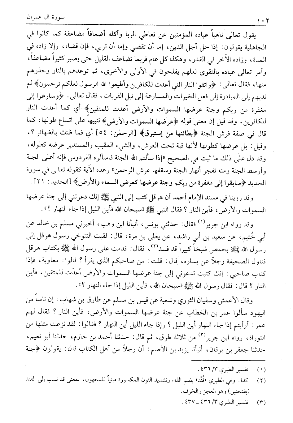 وَقَالَ الْأَعْمَشُ وَسُفْيَانُ الثَّوْرِيُّ وَشُعْبَةُ عَنْ قَيْسِ بْنِ مُسْلِمٍ عَنْ طَارِقِ بْنِ شِهَابٍ: أَنَّ نَاسًا مِنَ الْيَهُودِ سَأَلُوا عُمَرَ بْنَ الْخَطَّابِ عَنْ جنة عرضها السموات والأرض، فأين النار؟ فقال لهم عمر: أرأيتم إذا جاء النهار أين الليل؟ وإذا جاء الليل أين النهار؟ فَقَالُوا: لَقَدْ نَزَعْتَ مِثْلَهَا مِنَ التَّوْرَاةِ، رَوَاهُ ابن جرير «3» من ثلاثة طرق، ثُمَّ قَالَ: حَدَّثَنَا أَحْمَدُ بْنُ حَازِمٍ، حَدَّثَنَا أَبُو نُعَيْمٍ، حَدَّثَنَا جَعْفَرُ بْنُ بُرْقَانَ، أَنْبَأَنَا يَزِيدُ بْنُ الْأَصَمِّ: أَنَّ رَجُلًا مِنْ أَهْلِ الكتاب قال: يقولون