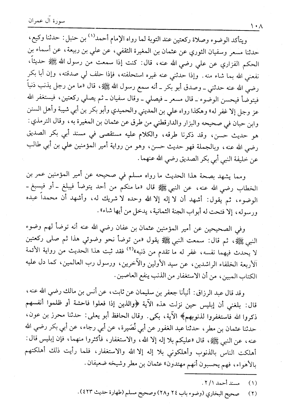 وَفِي الصَّحِيحَيْنِ عَنْ أَمِيرِ الْمُؤْمِنِينَ عُثْمَانَ بْنِ عَفَّانَ رَضِيَ اللَّهُ عنه أَنَّهُ تَوَضَّأَ لَهُمْ وُضُوءَ النَّبِيِّ صَلَّى اللَّهُ عَلَيْهِ وَسَلَّمَ، ثُمَّ قَالَ: سَمِعْتُ النَّبِيَّ صَلَّى اللَّهُ عَلَيْهِ وَسَلَّمَ يَقُولُ «مَنْ تَوَضَّأَ نَحْوَ وُضُوئِي هَذَا ثُمَّ صَلَّى رَكْعَتَيْنِ لَا يُحَدِّثُ فِيْهِمَا نَفْسَهُ، غُفِرَ لَهُ مَا تَقَدَّمَ مِنْ ذَنْبِهِ» «2» فَقَدْ ثَبَتَ هَذَا الْحَدِيثُ مِنْ رِوَايَةِ الْأَئِمَّةِ الْأَرْبَعَةِ الْخُلَفَاءِ الرَّاشِدِينَ، عَنْ سَيِّدِ الْأَوَّلِينَ وَالْآخِرِينَ، وَرَسُولِ رَبِّ الْعَالَمِينَ، كَمَا دَلَّ عَلَيْهِ الْكِتَابُ الْمُبِينُ، مِنْ أَنَّ الِاسْتِغْفَارَ مِنَ الذَّنْبِ يَنْفَعُ الْعَاصِينَ.
