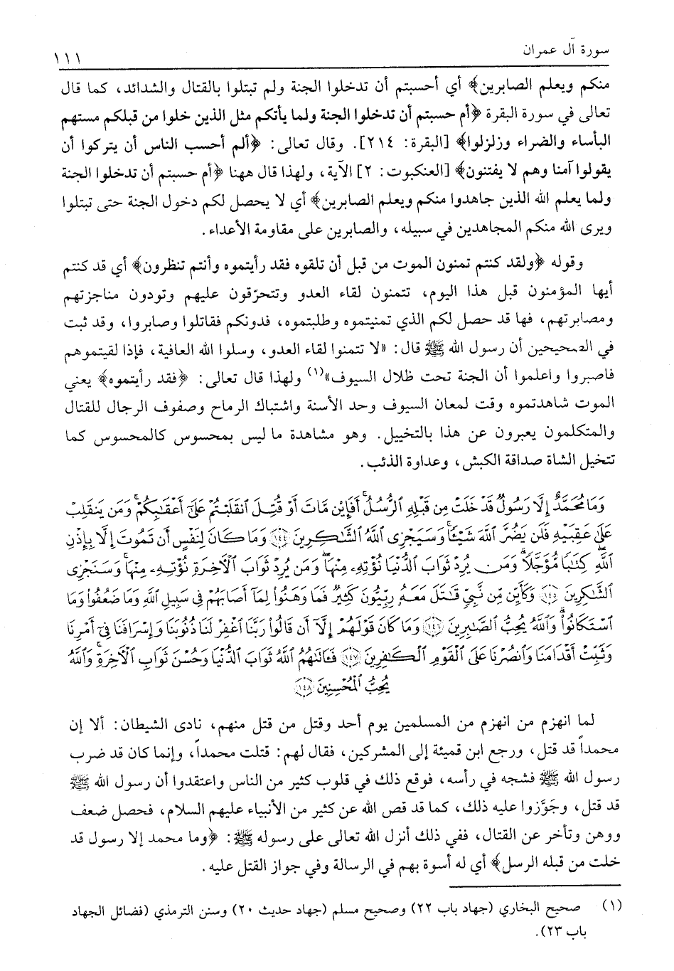 وَما مُحَمَّدٌ إِلاَّ رَسُولٌ قَدْ خَلَتْ مِنْ قَبْلِهِ الرُّسُلُ أَفَإِنْ ماتَ أَوْ قُتِلَ انْقَلَبْتُمْ عَلى أَعْقابِكُمْ وَمَنْ يَنْقَلِبْ عَلى عَقِبَيْهِ فَلَنْ يَضُرَّ اللَّهَ شَيْئاً وَسَيَجْزِي اللَّهُ الشَّاكِرِينَ (144) وَما كانَ لِنَفْسٍ أَنْ تَمُوتَ إِلاَّ بِإِذْنِ اللَّهِ كِتاباً مُؤَجَّلاً وَمَنْ يُرِدْ ثَوابَ الدُّنْيا نُؤْتِهِ مِنْها وَمَنْ يُرِدْ ثَوابَ الْآخِرَةِ نُؤْتِهِ مِنْها وَسَنَجْزِي الشَّاكِرِينَ (145) وَكَأَيِّنْ مِنْ نَبِيٍّ قاتَلَ مَعَهُ رِبِّيُّونَ كَثِيرٌ فَما وَهَنُوا لِما أَصابَهُمْ فِي سَبِيلِ اللَّهِ وَما ضَعُفُوا وَمَا اسْتَكانُوا وَاللَّهُ يُحِبُّ الصَّابِرِينَ (146) وَما كانَ قَوْلَهُمْ إِلاَّ أَنْ قالُوا رَبَّنَا اغْفِرْ لَنا ذُنُوبَنا وَإِسْرافَنا فِي أَمْرِنا وَثَبِّتْ أَقْدامَنا وَانْصُرْنا عَلَى الْقَوْمِ الْكافِرِينَ (147) فَآتاهُمُ اللَّهُ ثَوابَ الدُّنْيا وَحُسْنَ ثَوابِ الْآخِرَةِ وَاللَّهُ يُحِبُّ الْمُحْسِنِينَ (148)