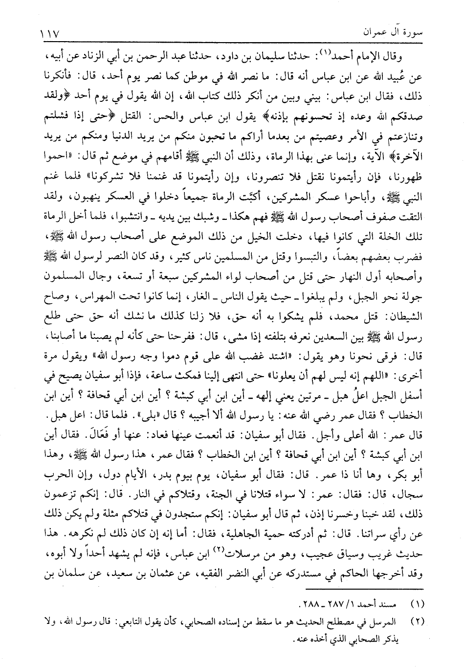 وَقَالَ الْإِمَامُ أَحْمَدُ «1» : حَدَّثَنَا سُلَيْمَانُ بْنُ دَاوُدَ، حَدَّثَنَا عَبْدُ الرَّحْمَنِ بْنُ أَبِي الزِّنَادِ عَنْ أبيه، عَنْ عُبَيْدِ اللَّهِ عَنِ ابْنِ عَبَّاسٍ أَنَّهُ قَالَ: مَا نَصَرَ اللَّهُ فِي مَوْطِنٍ كَمَا نصر يَوْمَ أُحُدٍ، قَالَ: فَأَنْكَرْنَا ذَلِكَ، فَقَالَ ابْنُ عَبَّاسٍ: بَيْنِي وَبَيْنَ مَنْ أَنْكَرَ ذَلِكَ كِتَابُ اللَّهِ، إِنَّ اللَّهَ يَقُولُ فِي يَوْمِ أُحُدٍ وَلَقَدْ صَدَقَكُمُ اللَّهُ وَعْدَهُ إِذْ تَحُسُّونَهُمْ بِإِذْنِهِ يقول ابن عباس والحسن: الْقَتْلُ حَتَّى إِذا فَشِلْتُمْ وَتَنازَعْتُمْ فِي الْأَمْرِ وَعَصَيْتُمْ مِنْ بَعْدِ مَا أَراكُمْ مَا تُحِبُّونَ مِنْكُمْ مَنْ يُرِيدُ الدُّنْيا وَمِنْكُمْ مَنْ يُرِيدُ الْآخِرَةَ الْآيَةَ، وَإِنَّمَا عَنَى بِهَذَا الرُّمَاةَ، وَذَلِكَ أَنَّ النَّبِيَّ صَلَّى اللَّهُ عَلَيْهِ وَسَلَّمَ أَقَامَهُمْ فِي مَوْضِعٍ ثُمَّ قَالَ: «احْمُوا ظُهُورَنَا، فَإِنْ رَأَيْتُمُونَا نُقْتَلُ فَلَا تَنْصُرُونَا، وَإِنْ رَأَيْتُمُونَا قَدْ غَنِمْنَا فَلَا تُشْرِكُونَا» فَلَمَّا غَنِمَ النَّبِيُّ صَلَّى اللَّهُ عَلَيْهِ وَسَلَّمَ، وَأَبَاحُوا عَسْكَرَ الْمُشْرِكِينَ، أَكَبَّتِ الرماة جميعا دخلوا فِي الْعَسْكَرِ يَنْهَبُونَ، وَلَقَدِ الْتَقَتْ صُفُوفُ أَصْحَابِ رَسُولِ اللَّهِ صَلَّى اللَّهُ عَلَيْهِ وَسَلَّمَ فَهُمْ هَكَذَا- وَشَبَّكَ بَيْنَ يَدَيْهِ- وَانْتَشَبُوا، فَلَمَّا أَخَلَّ الرُّمَاةُ تِلْكَ الْخَلَّةِ الَّتِي كَانُوا فِيهَا، دَخَلَتِ الْخَيْلُ مِنْ ذَلِكَ الْمَوْضِعِ عَلَى أَصْحَابِ رَسُولِ اللَّهِ صَلَّى اللَّهُ عَلَيْهِ وَسَلَّمَ، فَضَرَبَ بَعْضُهُمْ بَعْضًا، وَالْتَبُسُوا وَقُتِلَ مِنَ الْمُسْلِمِينَ نَاسٌ كَثِيرٌ، وقد كان النصر لِرَسُولِ اللَّهِ صَلَّى اللَّهُ عَلَيْهِ وَسَلَّمَ وَأَصْحَابِهِ أَوَّلَ النَّهَارِ حَتَّى قُتِلَ مِنْ أَصْحَابِ لِوَاءِ الْمُشْرِكِينَ سَبْعَةٌ أَوْ تِسْعَةٌ، وَجَالَ الْمُسْلِمُونَ جَوْلَةً نَحْوَ الْجَبَلِ، وَلَمْ يَبْلُغُوا- حَيْثُ يَقُولُ النَّاسُ- الغار، إنما كانوا تَحْتَ الْمِهْرَاسِ، وَصَاحَ الشَّيْطَانُ: قُتِلَ مُحَمَّدٌ، فَلَمْ يشكوا به أنه حق، فلا زِلْنَا كَذَلِكَ مَا نَشُكُّ أَنَّهُ حَقٌّ حَتَّى طَلَعَ رَسُولُ اللَّهِ صَلَّى اللَّهُ عَلَيْهِ وَسَلَّمَ بَيْنَ السَّعْدَيْنِ نَعْرِفُهُ بِتَلَفُّتِهِ إِذَا مَشَى، قَالَ: فَفَرِحْنَا حَتَّى كَأَنَّهُ لَمْ يُصِبْنَا مَا أَصَابَنَا، قَالَ: فَرَقِيَ نَحْوَنَا وَهُوَ يَقُولُ: «اشْتَدَّ غَضَبَ اللَّهِ عَلَى قَوْمٍ دَمَّوْا وَجْهَ رَسُولِ اللَّهِ» وَيَقُولُ مَرَّةً أُخْرَى: «اللَّهُمَّ إِنَّهُ لَيْسَ لَهُمْ أَنْ يَعْلُونَا» حَتَّى انْتَهَى إِلَيْنَا فَمَكَثَ سَاعَةً، فَإِذَا أَبُو سُفْيَانَ يَصِيحُ فِي أَسْفَلِ الْجَبَلِ اعل هبل- مرتين يعني إلهه- أَيْنَ ابْنُ أَبِي كَبْشَةَ؟ أَيْنَ ابْنُ أَبِي قحافة؟ أين ابن الخطاب؟ فَقَالَ عُمَرُ رَضِيَ اللَّهُ عَنْهُ: يَا رَسُولَ اللَّهِ أَلَا أُجِيبَهُ؟ قَالَ «بَلَى» . فَلَمَّا قَالَ: اعْلُ هُبَلُ.
