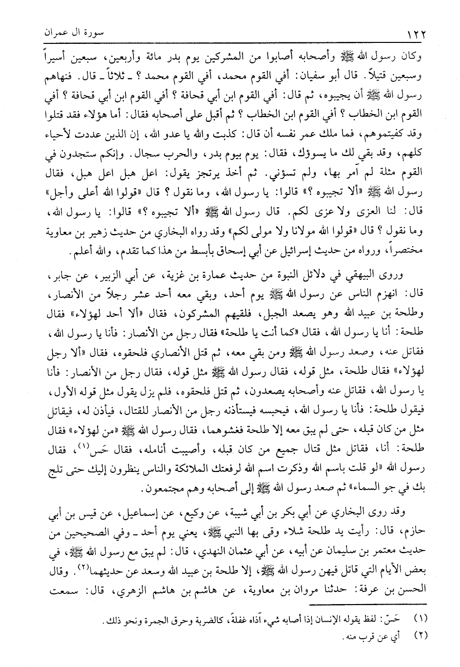 وَرَوَى الْبَيْهَقِيُّ فِي دَلَائِلِ النُّبُوَّةِ مِنْ حَدِيثِ عُمَارَةَ بْنِ غَزِيَّةَ، عَنْ أَبِي الزُّبَيْرِ، عَنْ جَابِرٍ، قَالَ: انْهَزَمَ النَّاسُ عَنْ رَسُولِ اللَّهِ صَلَّى اللَّهُ عَلَيْهِ وَسَلَّمَ يَوْمَ أُحُدٍ، وَبَقِيَ مَعَهُ أَحَدَ عَشَرَ رَجُلًا مِنَ الْأَنْصَارِ، وَطَلْحَةُ بْنُ عُبَيْدِ اللَّهِ وَهُوَ يَصْعَدُ الْجَبَلَ، فَلَقِيَهُمُ الْمُشْرِكُونَ، فَقَالَ «أَلَا أَحَدٌ لِهَؤُلَاءِ» فَقَالَ طَلْحَةُ: أَنَا يَا رَسُولَ اللَّهِ، فَقَالَ «كَمَا أَنْتَ يَا طَلْحَةُ» فَقَالَ رَجُلٌ مِنَ الْأَنْصَارِ: فَأَنَا يَا رَسُولَ اللَّهِ، فَقَاتَلَ عَنْهُ، وَصَعِدَ رَسُولُ اللَّهِ صَلَّى اللَّهُ عَلَيْهِ وَسَلَّمَ وَمَنْ بَقِيَ مَعَهُ، ثُمَّ قُتِلَ الْأَنْصَارِيُّ فَلَحِقُوهُ، فَقَالَ «أَلَا رَجُلٌ لِهَؤُلَاءِ» فَقَالَ طَلْحَةُ، مِثْلَ قَوْلِهِ، فَقَالَ رَسُولُ اللَّهِ صَلَّى اللَّهُ عَلَيْهِ وَسَلَّمَ مِثْلَ قَوْلِهِ، فَقَالَ رَجُلٌ مِنَ الْأَنْصَارِ: فَأَنَا يَا رَسُولَ اللَّهِ، فَقَاتَلَ عَنْهُ وأصحابه يصعدون، ثُمَّ قُتِلَ فَلَحِقُوهُ، فَلَمْ يَزَلْ يَقُولُ مِثْلَ قَوْلِهِ الْأَوَّلِ، فَيَقُولُ طَلْحَةُ: فَأَنَا يَا رَسُولَ اللَّهِ، فَيَحْبِسُهُ فَيَسْتَأْذِنُهُ رَجُلٌ مِنَ الْأَنْصَارِ لِلْقِتَالِ، فَيَأْذَنُ لَهُ، فَيُقَاتِلُ مِثْلَ مَنْ كَانَ قَبْلَهُ، حَتَّى لَمْ يَبْقَ مَعَهُ إِلَّا طَلْحَةُ فَغَشَوْهُمَا، فَقَالَ رَسُولُ اللَّهِ صَلَّى اللَّهُ عَلَيْهِ وَسَلَّمَ «مَنْ لِهَؤُلَاءِ» فَقَالَ طَلْحَةُ: أَنَا، فَقَاتَلَ مِثْلَ قِتَالِ جَمِيعِ مَنْ كَانَ قَبْلَهُ، وَأُصِيبَتْ أَنَامِلُهُ، فَقَالَ حَسِّ «1» ، فَقَالَ رَسُولُ اللَّهِ «لَوْ قُلْتَ بِاسْمِ اللَّهِ وَذَكَرْتَ اسْمَ اللَّهِ لَرَفَعَتْكَ الْمَلَائِكَةُ وَالنَّاسُ يَنْظُرُونَ إِلَيْكَ حَتَّى تَلِجَ بِكَ فِي جَوِّ السَّمَاءِ» ثُمَّ صَعِدَ رَسُولُ اللَّهِ صَلَّى اللَّهُ عَلَيْهِ وَسَلَّمَ إِلَى أَصْحَابِهِ وَهُمْ مُجْتَمِعُونَ.