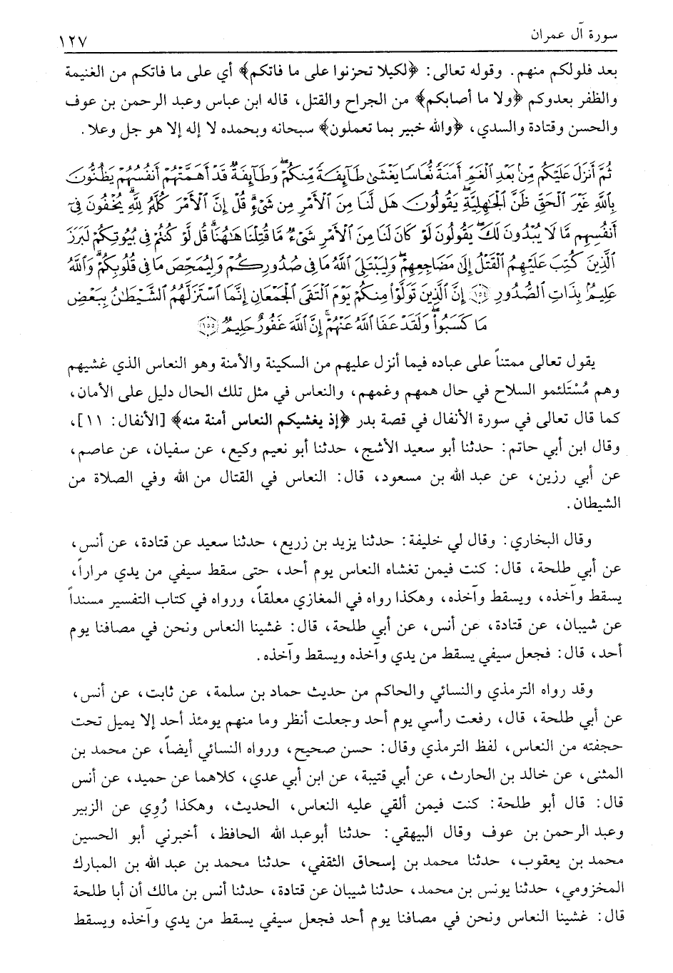 وَقَدْ رَوَاهُ التِّرْمِذِيُّ وَالنَّسَائِيُّ وَالْحَاكِمُ مِنْ حَدِيثِ حَمَّادِ بْنِ سَلَمَةَ، عَنْ ثَابِتٍ، عن أنس، عَنْ أَبِي طَلْحَةَ، قَالَ، رَفَعْتُ رَأْسِي يَوْمَ أُحُدٍ وَجَعَلْتُ أَنْظُرُ وَمَا مِنْهُمْ يَوْمَئِذٍ أَحَدٌ إلا يميل تَحْتَ حَجَفَتِهِ مِنَ النُّعَاسِ، لَفْظُ التِّرْمِذِيِّ وَقَالَ: حَسَنٌ صَحِيحٌ، وَرَوَاهُ النَّسَائِيُّ أَيْضًا، عَنْ مُحَمَّدِ بْنِ الْمُثَنَّى، عَنْ خَالِدِ بْنِ الْحَارِثِ، عَنْ أَبِي قُتَيْبَةَ، عَنِ ابْنِ أَبِي عَدِيٍّ، كِلَاهُمَا عَنْ حُمَيْدٍ، عَنْ أَنَسٍ قَالَ: قَالَ أَبُو طَلْحَةَ: كُنْتُ فِيمَنْ أُلْقِيَ عَلَيْهِ النُّعَاسُ، الْحَدِيثَ، وَهَكَذَا رُوِيَ عَنِ الزُّبَيْرِ وَعَبْدِ الرَّحْمَنِ بْنِ عوف وقال البيهقي: حدثنا أَبُو عَبْدِ اللَّهِ الْحَافِظُ، أَخْبَرَنِي أَبُو الْحُسَيْنِ مُحَمَّدُ بْنُ يَعْقُوبَ، حَدَّثَنَا مُحَمَّدُ بْنُ إِسْحَاقَ الثَّقَفِيُّ، حَدَّثَنَا مُحَمَّدُ بْنُ عَبْدِ اللَّهِ بْنُ الْمُبَارَكِ الْمَخْزُومِيُّ، حَدَّثَنَا يُونُسُ بْنُ مُحَمَّدٍ، حَدَّثَنَا شَيْبَانُ عَنْ قَتَادَةَ، حَدَّثَنَا أَنَسُ بْنُ مَالِكٍ أَنَّ أَبَا طَلْحَةَ قَالَ: غَشِيَنَا النُّعَاسُ وَنَحْنُ فِي مَصَافِّنَا يَوْمَ أُحُدٍ فَجَعَلَ سَيْفِي يَسْقُطُ مِنْ يَدِي وَآخُذُهُ وَيَسْقُطُ