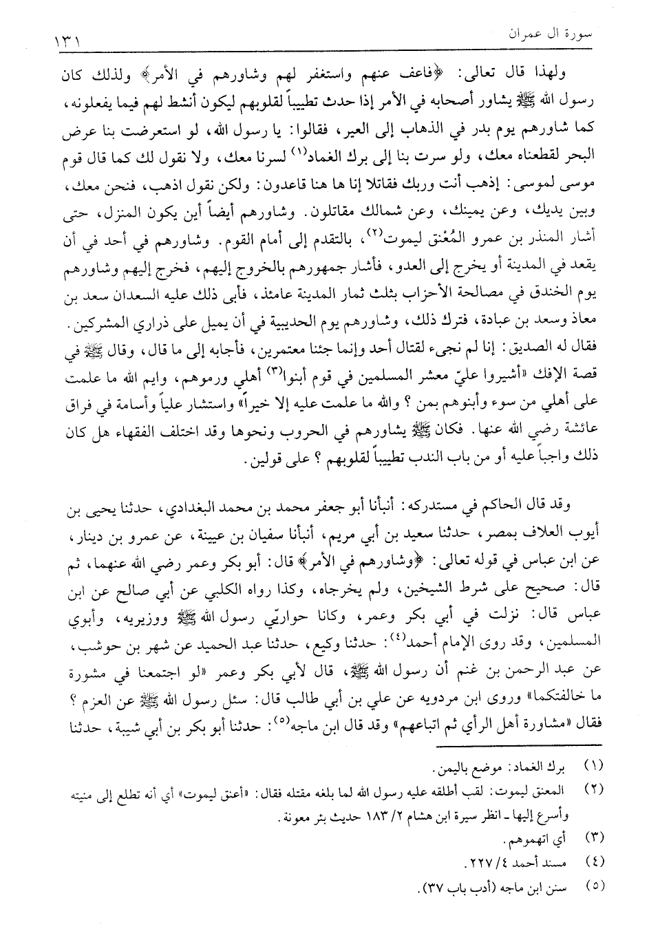 وَلِهَذَا قَالَ تَعَالَى: فَاعْفُ عَنْهُمْ وَاسْتَغْفِرْ لَهُمْ وَشاوِرْهُمْ فِي الْأَمْرِ وَلِذَلِكَ كَانَ رَسُولُ اللَّهِ صَلَّى اللَّهُ عَلَيْهِ وَسَلَّمَ يُشَاوِرُ أَصْحَابَهُ فِي الأمر إذا حدث تطييبا لقلوبهم ليكون أنشط لهم فيما يفعلونه، كَمَا شَاوَرَهُمْ يَوْمَ بَدْرٍ فِي الذَّهَابِ إِلَى الْعِيرِ، فَقَالُوا: يَا رَسُولَ اللَّهِ، لَوِ اسْتَعْرَضْتَ بِنَا عُرْضَ الْبَحْرِ لَقَطَعْنَاهُ مَعَكَ، وَلَوْ سِرْتَ بِنَا إِلَى بَرْكِ الْغَمَادِ «1» لِسِرْنَا مَعَكَ، وَلَا نَقُولُ لَكَ كَمَا قَالَ قَوْمُ مُوسَى لِمُوسَى: اذْهَبْ أَنْتَ وَرَبُّكَ فَقَاتِلَا إِنَّا هَاهُنَا قَاعِدُونَ: وَلَكِنْ نَقُولُ اذْهَبْ، فَنَحْنُ مَعَكَ، وَبَيْنَ يَدَيْكَ، وَعَنْ يَمِينِكَ، وَعَنْ شِمَالِكَ مُقَاتِلُونَ. وَشَاوَرَهُمْ أَيْضًا أَيْنَ يَكُونُ الْمَنْزِلُ، حَتَّى أَشَارَ الْمُنْذِرُ بْنُ عَمْرٍو الْمُعْنِقُ لِيَمُوتَ «2» ، بِالتَّقَدُّمِ إِلَى أَمَامِ الْقَوْمِ. وَشَاوَرَهُمْ فِي أُحُدٍ فِي أَنْ يَقْعُدَ فِي الْمَدِينَةِ أَوْ يَخْرُجَ إِلَى الْعَدْوِّ، فَأَشَارَ جُمْهُورُهُمْ بِالْخُرُوجِ إِلَيْهِمْ، فَخَرَجَ إِلَيْهِمْ وَشَاوَرَهُمْ يَوْمَ الْخَنْدَقِ فِي مُصَالَحَةِ الْأَحْزَابِ بِثُلُثِ ثِمَارِ الْمَدِينَةِ عَامَئِذٍ، فأبى ذلك عليه السَعْدَانِ سَعْدُ بْنُ مُعَاذٍ وَسَعْدُ بْنُ عُبَادَةَ، فَتَرَكَ ذَلِكَ، وَشَاوَرَهُمْ يَوْمَ الْحُدَيْبِيَةِ فِي أَنْ يَمِيلَ عَلَى ذَرَارِيِّ الْمُشْرِكِينَ.