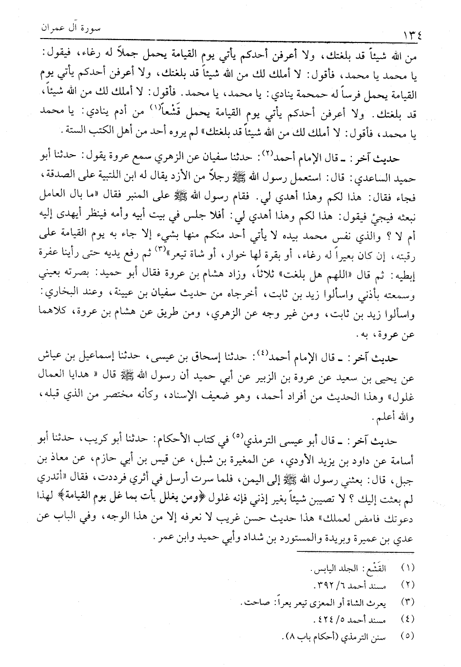 حَدِيثٌ آخَرُ: - قَالَ الْإِمَامُ أَحْمَدُ «2» : حَدَّثَنَا سُفْيَانُ عن الزهري سمع عروة يقول: حدثنا أَبُو حُمَيْدٍ السَّاعِدِيُّ: قَالَ: اسْتَعْمَلَ رَسُولُ اللَّهِ صَلَّى اللَّهُ عَلَيْهِ وَسَلَّمَ رَجُلًا مِنَ الْأَزْدِ يُقَالُ لَهُ ابْنُ اللُّتْبِيَّةِ عَلَى الصَّدَقَةِ، فَجَاءَ فَقَالَ: هَذَا لَكُمْ وَهَذَا أُهْدِيَ لِي. فَقَامَ رَسُولُ اللَّهِ صَلَّى اللَّهُ عَلَيْهِ وَسَلَّمَ على الْمِنْبَرِ فَقَالَ «مَا بَالُ الْعَامِلِ نَبْعَثُهُ فَيَجِيءُ فَيَقُولُ: هَذَا لَكُمْ وَهَذَا أُهْدِيَ لِي: أَفَلَا جَلَسَ فِي بَيْتِ أَبِيهِ وَأُمِّهِ فَيَنْظُرَ أَيُهْدَى إِلَيْهِ أَمْ لَا؟ وَالَّذِي نَفْسُ مُحَمَّدٍ بِيَدِهِ لَا يَأْتِي أَحَدٌ مِنْكُمْ مِنْهَا بِشَيْءٍ إِلَّا جَاءَ بِهِ يَوْمَ الْقِيَامَةِ عَلَى رَقَبَتِهِ، إِنْ كَانَ بَعِيرًا لَهُ رُغَاءٌ، أَوْ بَقَرَةً لَهَا خُوَارٌ، أَوْ شَاةً تَيْعَرُ» «3» ثُمَّ رَفَعَ يَدَيْهِ حَتَّى رَأَيْنَا عُفْرَةَ إِبْطَيْهِ: ثُمَّ قَالَ «اللَّهُمَّ هَلْ بَلَّغْتُ» ثَلَاثًا، وَزَادَ هِشَامُ بْنُ عُرْوَةَ فقال أبو حميد: بصرته بعيني وسمعته بأذني واسألوا زَيْدَ بْنَ ثَابِتٍ، أَخْرَجَاهُ مِنْ حَدِيثِ سُفْيَانَ بن عيينة، وعند البخاري:
