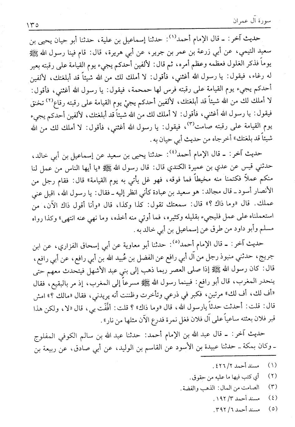 حَدِيثٌ آخَرُ: - قَالَ الْإِمَامُ أَحْمَدُ «1» : حَدَّثَنَا إِسْمَاعِيلُ بن عُلَيَّةَ، حَدَّثَنَا أَبُو حَيَّانَ يَحْيَى بْنُ سَعِيدٍ التَّيْمِيُّ، عَنْ أَبِي زُرْعَةَ بْنِ عُمَرَ بْنِ جَرِيرٍ، عَنْ أَبِي هُرَيْرَةَ، قَالَ: قَامَ فِينَا رَسُولُ اللَّهِ صَلَّى اللَّهُ عَلَيْهِ وَسَلَّمَ يَوْمًا فَذَكَرَ الْغُلُولَ فَعَظَّمَهُ وَعَظَّمَ أَمْرَهُ، ثُمَّ قَالَ: لألفين أَحَدُكُمْ يَجِيءُ يَوْمَ الْقِيَامَةِ عَلَى رَقَبَتِهِ بَعِيرٌ لَهُ رُغَاءٌ، فَيَقُولُ: يَا رَسُولَ اللَّهِ أَغِثْنِي، فَأَقُولُ: لَا أَمْلِكُ لَكَ مِنَ اللَّهِ شَيْئًا قد أبلغتك، لألفين أَحَدَكُمْ يَجِيءُ يَوْمَ الْقِيَامَةِ عَلَى رَقَبَتِهِ فَرَسٌ لها حَمْحَمَةٌ، فَيَقُولُ: يَا رَسُولَ اللَّهِ أَغِثْنِي، فَأَقُولُ: