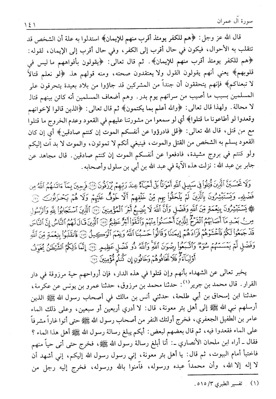 وَلا تَحْسَبَنَّ الَّذِينَ قُتِلُوا فِي سَبِيلِ اللَّهِ أَمْواتاً بَلْ أَحْياءٌ عِنْدَ رَبِّهِمْ يُرْزَقُونَ (169) فَرِحِينَ بِما آتاهُمُ اللَّهُ مِنْ فَضْلِهِ وَيَسْتَبْشِرُونَ بِالَّذِينَ لَمْ يَلْحَقُوا بِهِمْ مِنْ خَلْفِهِمْ أَلاَّ خَوْفٌ عَلَيْهِمْ وَلا هُمْ يَحْزَنُونَ (170) يَسْتَبْشِرُونَ بِنِعْمَةٍ مِنَ اللَّهِ وَفَضْلٍ وَأَنَّ اللَّهَ لَا يُضِيعُ أَجْرَ الْمُؤْمِنِينَ (171) الَّذِينَ اسْتَجابُوا لِلَّهِ وَالرَّسُولِ مِنْ بَعْدِ مَا أَصابَهُمُ الْقَرْحُ لِلَّذِينَ أَحْسَنُوا مِنْهُمْ وَاتَّقَوْا أَجْرٌ عَظِيمٌ (172) الَّذِينَ قالَ لَهُمُ النَّاسُ إِنَّ النَّاسَ قَدْ جَمَعُوا لَكُمْ فَاخْشَوْهُمْ فَزادَهُمْ إِيماناً وَقالُوا حَسْبُنَا اللَّهُ وَنِعْمَ الْوَكِيلُ (173)