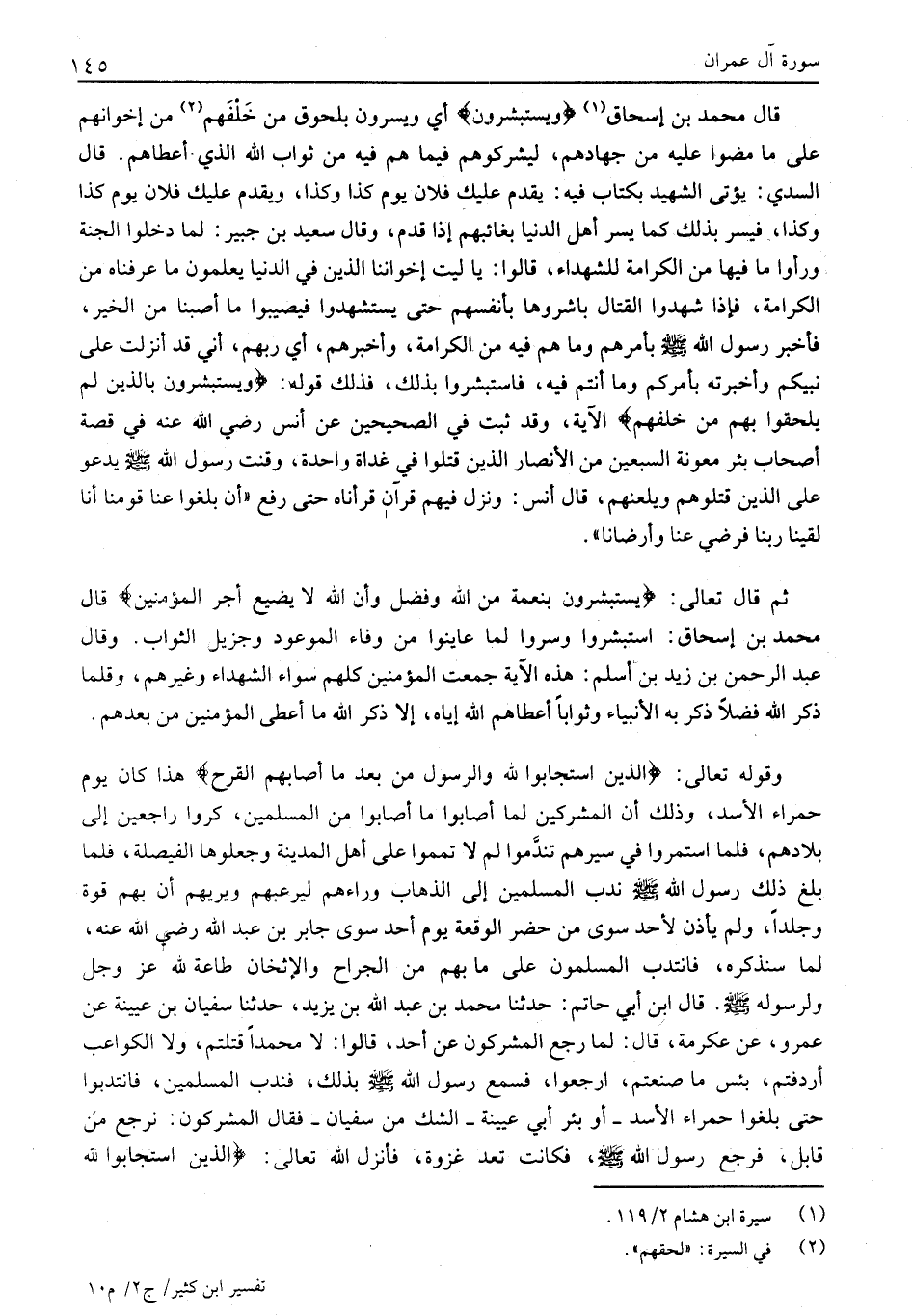 قَالَ مُحَمَّدُ بْنُ إِسْحَاقَ «1» وَيَسْتَبْشِرُونَ أَيْ وَيُسَرُّونَ بِلُحُوقِ مَنْ خَلْفَهُمْ «2» مِنْ إِخْوَانِهِمْ عَلَى مَا مَضَوْا عَلَيْهِ مِنْ جِهَادِهِمْ، لِيُشْرِكُوهُمْ فِيمَا هُمْ فيه من ثواب الله الذي أعطاهم. قَالَ السُّدِّيُّ: يُؤْتَى الشَّهِيدُ بِكِتَابٍ فِيهِ: يَقْدَمُ عَلَيْكَ فُلَانٌ يَوْمَ كَذَا وَكَذَا، وَيَقْدَمُ عَلَيْكَ فُلَانٌ يَوْمَ كَذَا وَكَذَا، فَيُسَرُّ بِذَلِكَ كَمَا يسر أهل الدنيا بغائبهم إذا قدم، وَقَالَ سَعِيدُ بْنُ جُبَيْرٍ: لَمَّا دَخَلُوا الْجَنَّةَ وَرَأَوْا مَا فِيهَا مِنَ الْكَرَامَةِ لِلشُّهَدَاءِ، قَالُوا: يَا لَيْتَ إِخْوَانَنَا الَّذِينَ فِي الدُّنْيَا يَعْلَمُونَ ما عرفناه من الكرامة، فإذا شهدوا القتال بَاشَرُوهَا بِأَنْفُسِهِمْ حَتَّى يُسْتَشْهَدُوا فَيُصِيبُوا مَا أَصَبْنَا مِنَ الْخَيْرِ، فَأُخْبِرَ رَسُولُ اللَّهِ صَلَّى اللَّهُ عَلَيْهِ وَسَلَّمَ بِأَمْرِهِمْ وَمَا هُمْ فِيهِ مِنَ الْكَرَامَةِ، وَأَخْبَرَهُمْ، أَيْ رَبُّهُمْ، أَنِّي قَدْ أَنْزَلْتُ عَلَى نَبِيِّكُمْ وَأَخْبَرْتُهُ بِأَمْرِكُمْ وَمَا أَنْتُمْ فِيهِ، فَاسْتَبْشِرُوا بِذَلِكَ، فَذَلِكَ قَوْلُهُ: وَيَسْتَبْشِرُونَ بِالَّذِينَ لَمْ يَلْحَقُوا بِهِمْ مِنْ خَلْفِهِمْ الْآيَةَ، وَقَدْ ثَبَتَ فِي الصَّحِيحَيْنِ عَنْ أَنَسٍ رَضِيَ اللَّهُ عَنْهُ فِي قِصَّةِ أَصْحَابِ بِئْرِ مَعُونَةَ السَّبْعِينَ مِنَ الْأَنْصَارِ الَّذِينَ قُتِلُوا فِي غَدَاةٍ وَاحِدَةٍ، وَقَنَتَ رَسُولُ اللَّهِ صَلَّى اللَّهُ عَلَيْهِ وَسَلَّمَ يَدْعُو على الذين قتلوهم وَيَلْعَنُهُمْ، قَالَ أَنَسٌ: وَنَزَلَ فِيهِمْ قُرْآنٌ قَرَأْنَاهُ حَتَّى رُفِعَ «أَنْ بَلِّغُوا عَنَّا قَوْمَنَا أَنَّا لَقِينَا رَبَّنَا فَرَضِيَ عَنَّا وَأَرْضَانَا» .