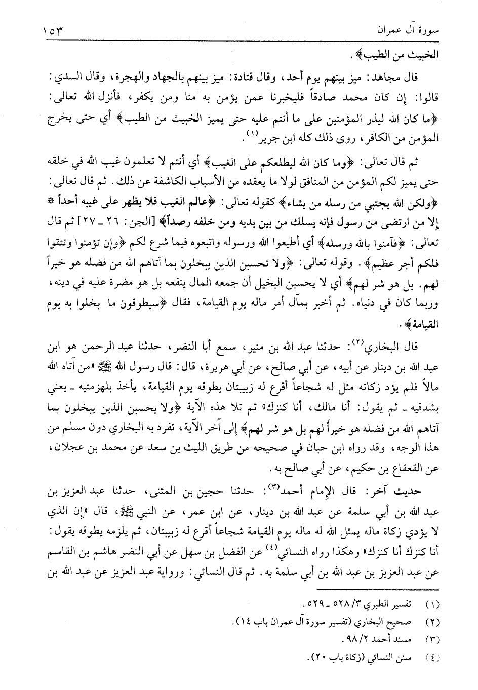 قَالَ الْبُخَارِيُّ «2» : حَدَّثَنَا عَبْدُ اللَّهِ بْنُ مُنِيرٍ، سَمِعَ أَبَا النَّضْرِ، حَدَّثَنَا عَبْدُ الرَّحْمَنِ هُوَ ابْنُ عَبْدِ اللَّهِ بْنِ دِينَارٍ عَنْ أَبِيهِ، عَنْ أَبِي صَالِحٍ، عَنْ أَبِي هُرَيْرَةَ، قَالَ: قَالَ رَسُولُ اللَّهِ صَلَّى اللَّهُ عَلَيْهِ وَسَلَّمَ «من آتَاهُ اللَّهُ مَالَا فَلَمْ يُؤَدِّ زَكَاتَهُ مُثِّلَ لَهُ شُجَاعًا أَقْرَعَ لَهُ زَبِيبَتَانِ يُطَوِّقُهُ يَوْمَ القيامة، يأخذ بلهزمتيه- يعني بشدقيه- ثم يَقُولُ: أَنَا مَالُكَ، أَنَا كَنْزُكَ» ثُمَّ تَلَا هَذِهِ الْآيَةَ وَلا يَحْسَبَنَّ الَّذِينَ يَبْخَلُونَ بِما آتاهُمُ اللَّهُ مِنْ فَضْلِهِ هُوَ خَيْراً لَهُمْ بَلْ هُوَ شَرٌّ لَهُمْ إِلَى آخِرِ الْآيَةِ، تَفَرَّدَ بِهِ الْبُخَارِيُّ دُونَ مُسْلِمٍ مِنْ هَذَا الْوَجْهِ، وَقَدْ رَوَاهُ ابْنُ حِبَّانَ فِي صَحِيحِهِ مِنْ طَرِيقِ اللَّيْثِ بْنِ سَعْدٍ عَنْ مُحَمَّدِ بْنِ عَجْلَانَ، عَنِ الْقَعْقَاعِ بْنِ حَكِيمٍ، عَنْ أَبِي صَالِحٍ بِهِ.